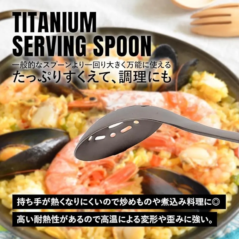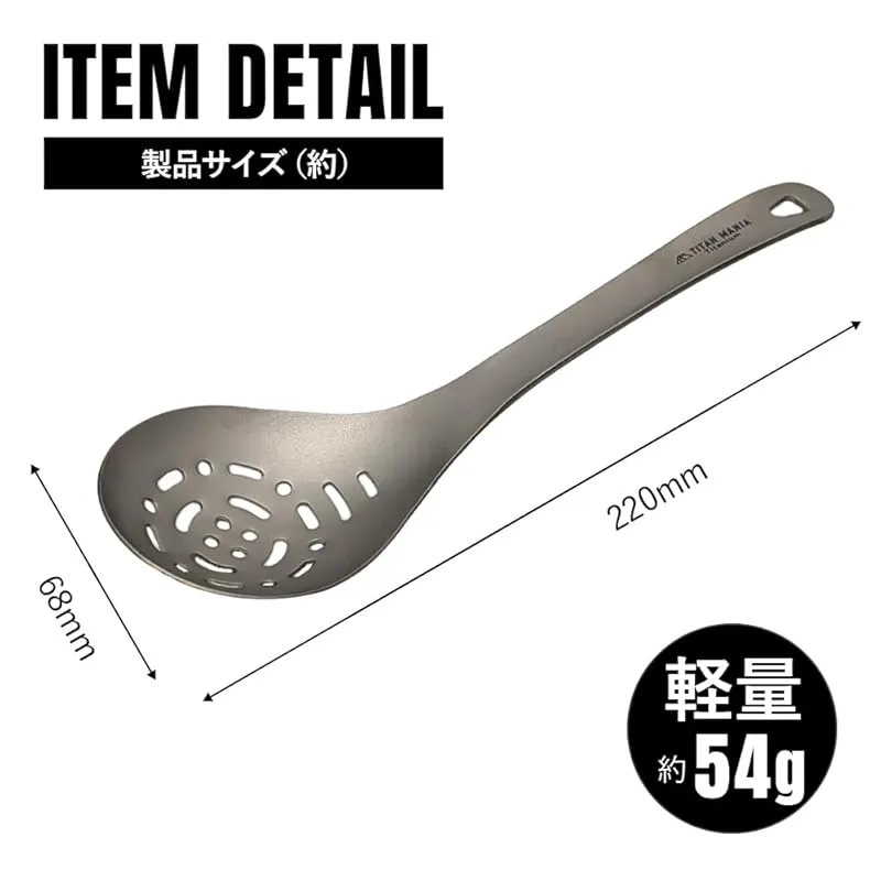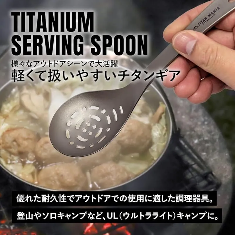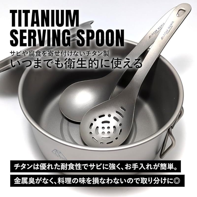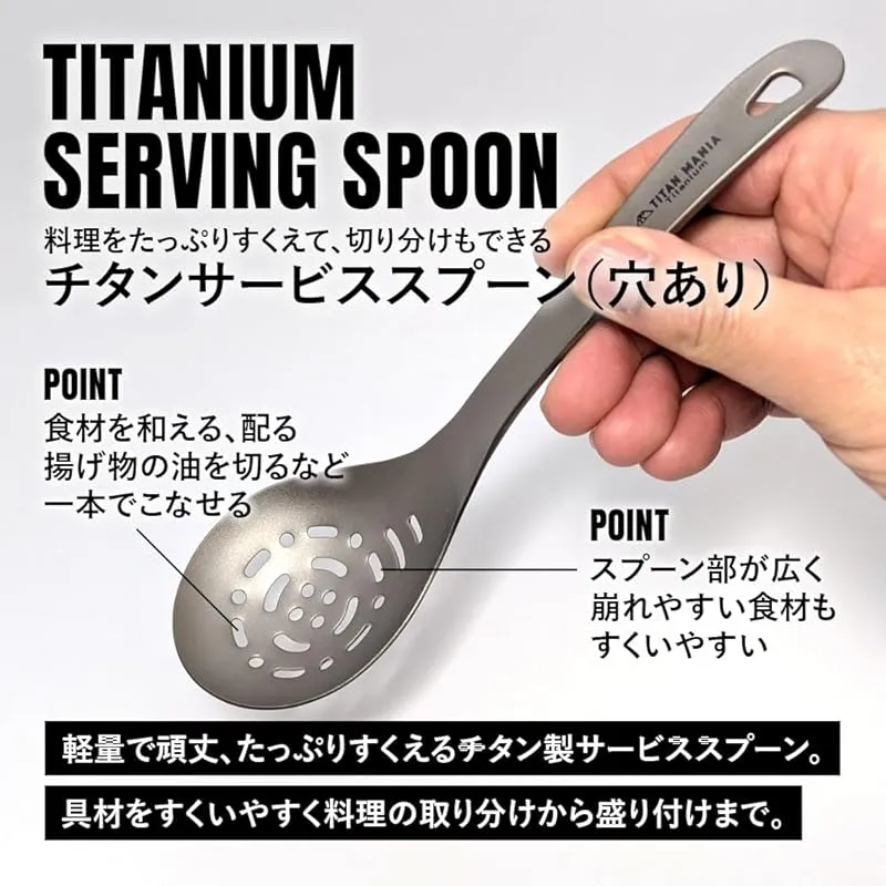 TITAN MANIA(チタンマニア) サービススプーン チタン製 取り分け スプーン たっぷりすくえる 軽量 頑丈 直火 穴あき サービングスプーン おたま レンゲ 一体型 調理器具 キッチンツール キャンプ ソロキャンプ アウトドア用品 キャンプ用品 0