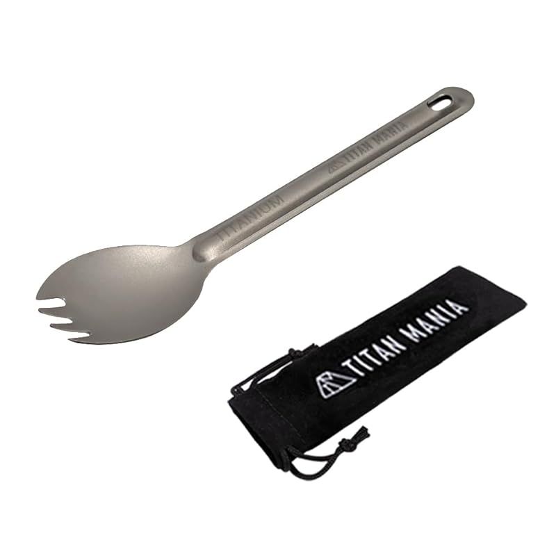 TITAN MANIA(チタンマニア) 先割れスプーン チタン製 軽量 頑丈 カトラリー スポーク ショート 持ち運び 直火 調理器具 キャンプ ソロキャンプ アウトドア用品 キャンプ用品 収納袋付き 0