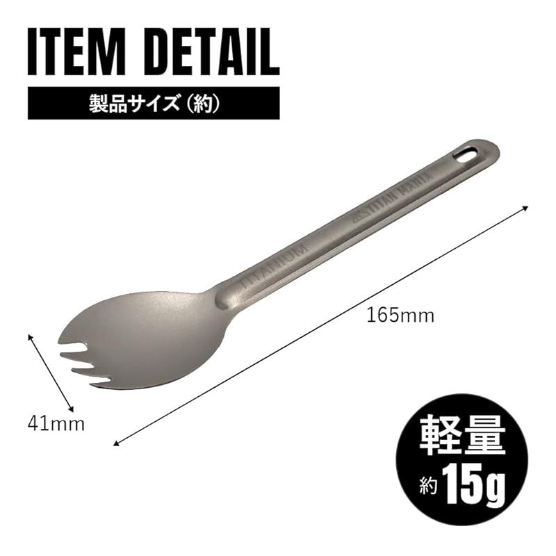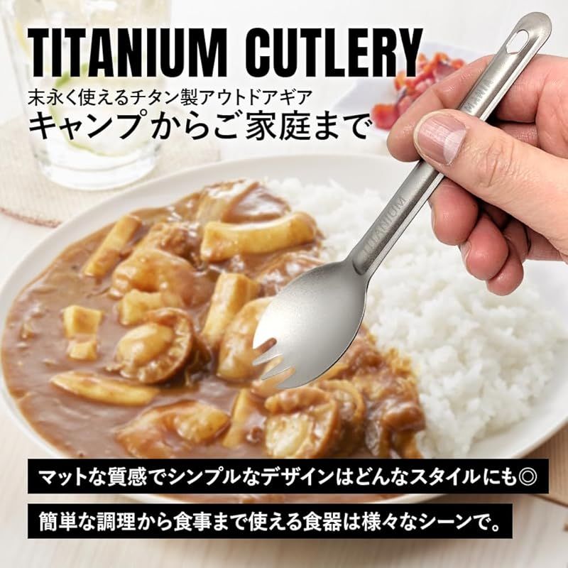 【商品説明】 軽量で頑丈、錆にも強いチタンカトラリー。食べ物をすくう、口に運ぶなど、手に馴染みやすく食事に適したサイズ。先割れタイプはフォークとして使えて便利。直火可能なので簡単な調理にも対応可能。チタンは食材に金属臭がついてしまうことがなく、食べ物の風味を損ないません。艶有りタイプには見た目も美しい鏡面加工。口当たりが良く、食べやすい。 一般的なメスティンにスタッキングできるサイズ感。重ねて収納可能。マットな質感で滑りにくく扱いやすい。高い耐久性でアウトドアでの使用に適したチタン製のキャンプギア。チタンは耐熱性が高く、熱に強いので高温で変形してしまうことがありません。熱伝導率が低く、放熱性が高いので熱くなりにくい。高い耐食性があるのでサビに強く、お手入れも簡単。 優れた耐食性と耐久性を兼ね備えたチタンアウトドアギア。軽くて携行性の高いキャンプギアは持ち運びしやすい。ご家庭のキッチンはもちろん、ソロキャンプや登山などウルトラライト(UL)キャンプ、バーベキューなど様々なアウトドアシーンでも。緊急時や災害時の備えとしても。軽量で頑丈なチタンギアは末永くお使いいただけます。