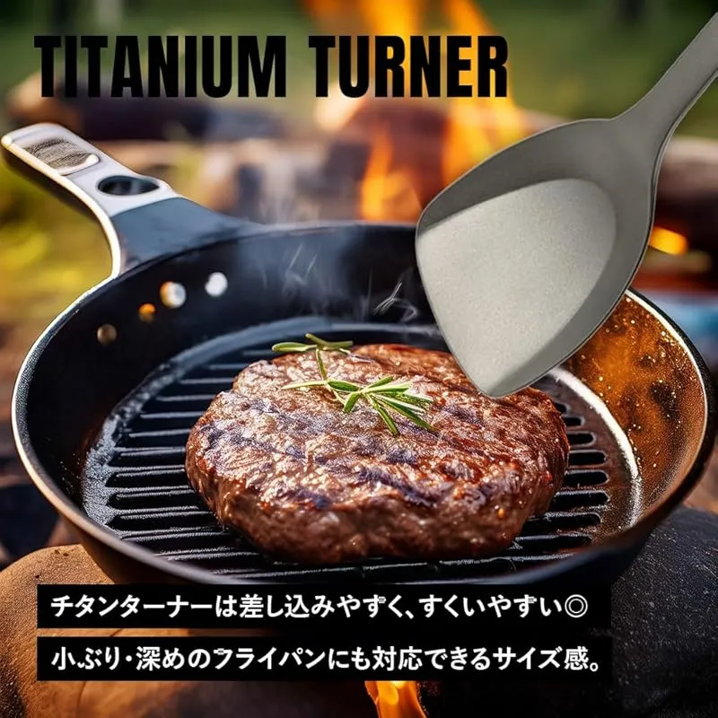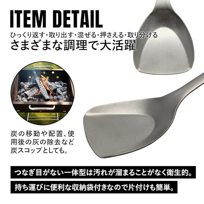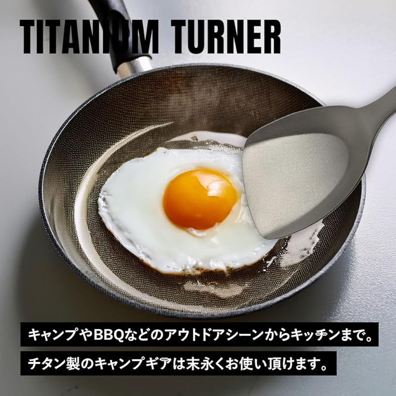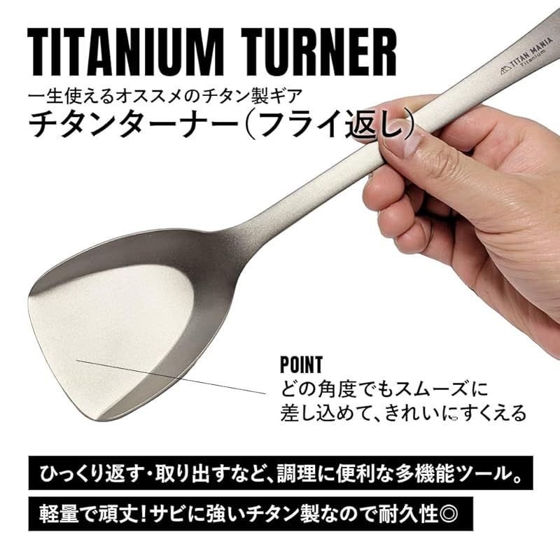 【セット内容】 本体、収納袋 ?軽量で頑丈!どの角度でもスムーズに差し込めて、すくいやすいチタンターナー(フライ返し)は、一生使えるオススメのチタン製ギア。食材をひっくり返す・取り出す・混ぜる・押さえる・取り分ける、さまざまな調理で大活躍の多機能ツール。小ぶり・深めのフライパンやグリルにも対応できるサイズ感。チタン製で焚き火やバーナーなど直火に対応可能。炭の移動や配置、使用後の灰の除去など炭スコップとしても。 ?チタンは金属特有の嫌な金属臭がしないので、食べ物の風味を損ないません。高い耐食性でサビに強いので使用後にガシガシ洗えてお手入れが簡単。持ち運びに便利な収納袋がついているので片付けもカンタン。つなぎ目がない一体型は汚れが溜まることがないので衛生的です。チタン製で頑丈なので重たい食材でも崩さず持ち上げることができます。 ?持ち運びしやすく、バックパッキングしやすいので、ソロキャンプや登山などウルトラライト(UL)キャンプにも。ハイキング、お花見やバーベキュー、バイクツーリング、釣りなど様々なアウトドアシーンはもちろん、ご家庭のキッチンでの普段使いにも。軽量で頑丈なチタン製のキャンプギアは末永くお使いいただけます。