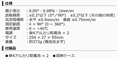 【 仕様 】/品名:マイゾックス デジレベル250/品番:222370/長さ(mm):254/高さ(mm):59/厚さ(mm):27/マグネット:有り/デジタル表示部精度:0.1以下(0、90) 0.2以下(その他角度)/気泡管感度:水平:0.5mm/m 垂直:0.75/m/気泡管精度:単4乾電池2本/電源:単4電池2本/最小表示:0.05、0.08%、1mm/m/計測範囲:490(0360)/防塵・防水性能:IP54/精度:0.1(0&90 )、0.2(その他の角度)/