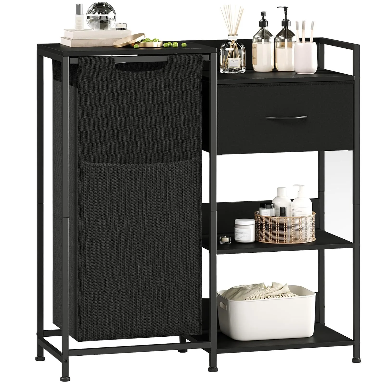 【数量限定】ランドリーバスケット、3段棚付き2セクションランドリーバスケット、ランドリーソーター付き衣類ラック、キャスター付き 取り外し可能なバッグ Somdot ブラック ブラック
