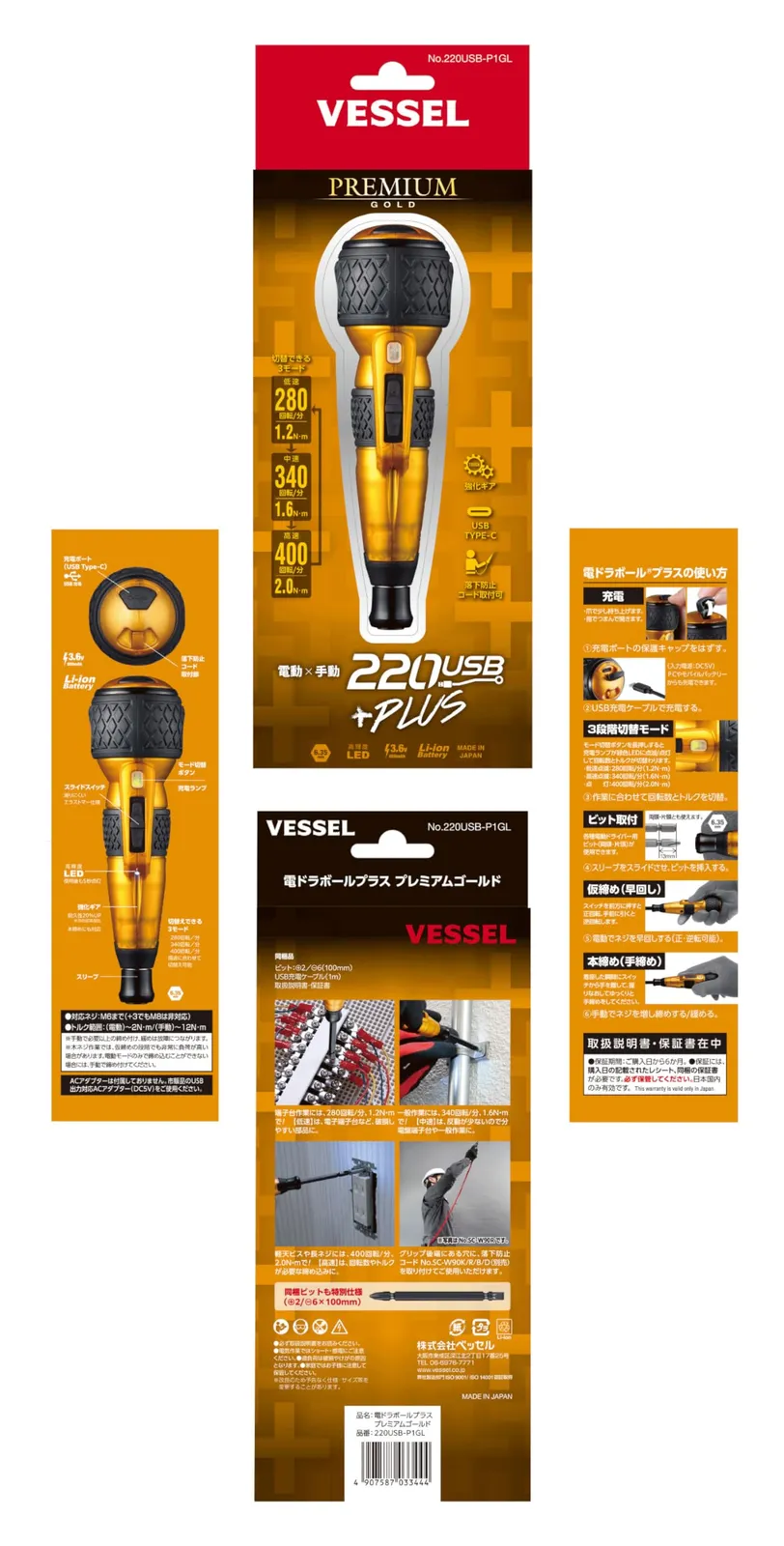 ベッセル(VESSEL) 電動 ボールグリップ ドライバー プラス プレミアム 3段階切替モード 限定色 (金) ビット1本付 220USB-P1GL [ゴールド]