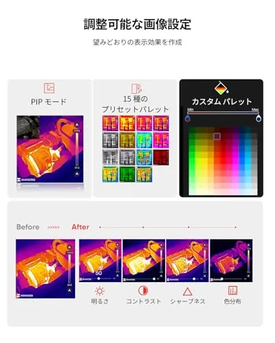 【柔軟な測定設定】3つの温度測定モード(スポット/エリア/自動追跡)、15種類のカラーパレット、温度アラート設定など、用途に応じてカスタマイズ可能。温度単位も摂氏・華氏・ケルビンに切り替えられます。