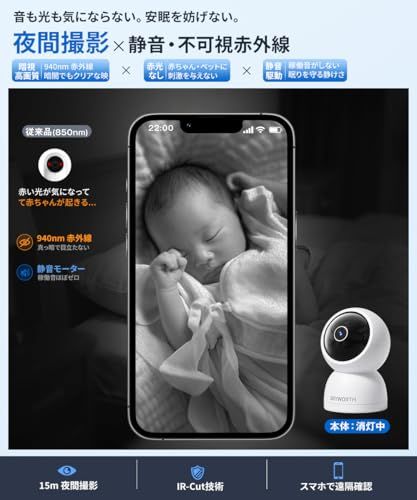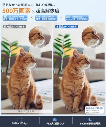【2026新進化・3K 高画質】赤ちゃんカメラ は500万画素(28801620P)とF1.6大口径レンズで、細部までくっきり鮮明に映像を表示。防犯カメラ 室内 として、QHDクラスの高精細映像は逆光でも自然に見やすく、光害のない940nm赤外線暗視により真っ暗な屋内でも、夜間でも鮮明な映像でご確認頂けます。