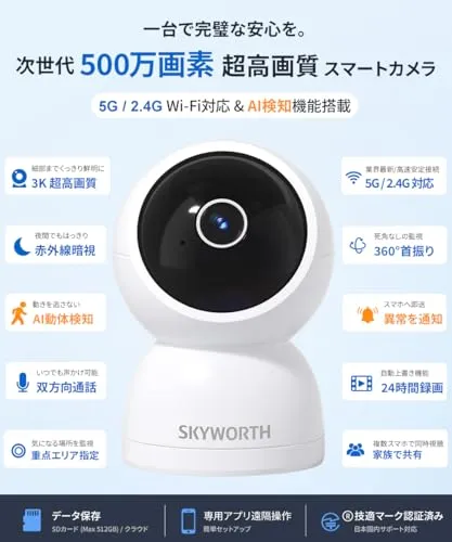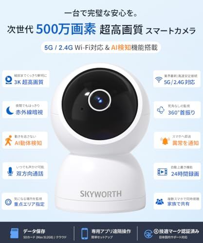 【2026改良型・500万画素】Skyworth ペットカメラ 3K画質 見守りカメラ iphone対応 防犯カメラ 室内 ベビーモニター スマホ連動 監視カメラ 録画機能付き ネットワークカメラ 双方向通話 ベビーカメラ ペット/高齢者 見守り 赤ちゃ★tm