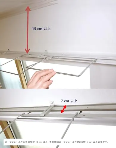 カーテンレールと天井の間が15cm以上、手前側のカーテンレールと壁の間が7cm以上必要です。