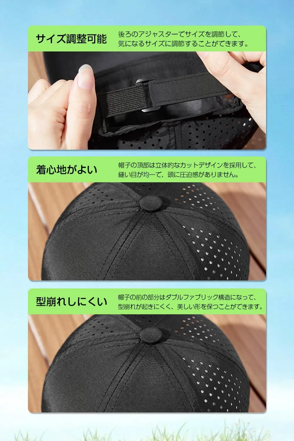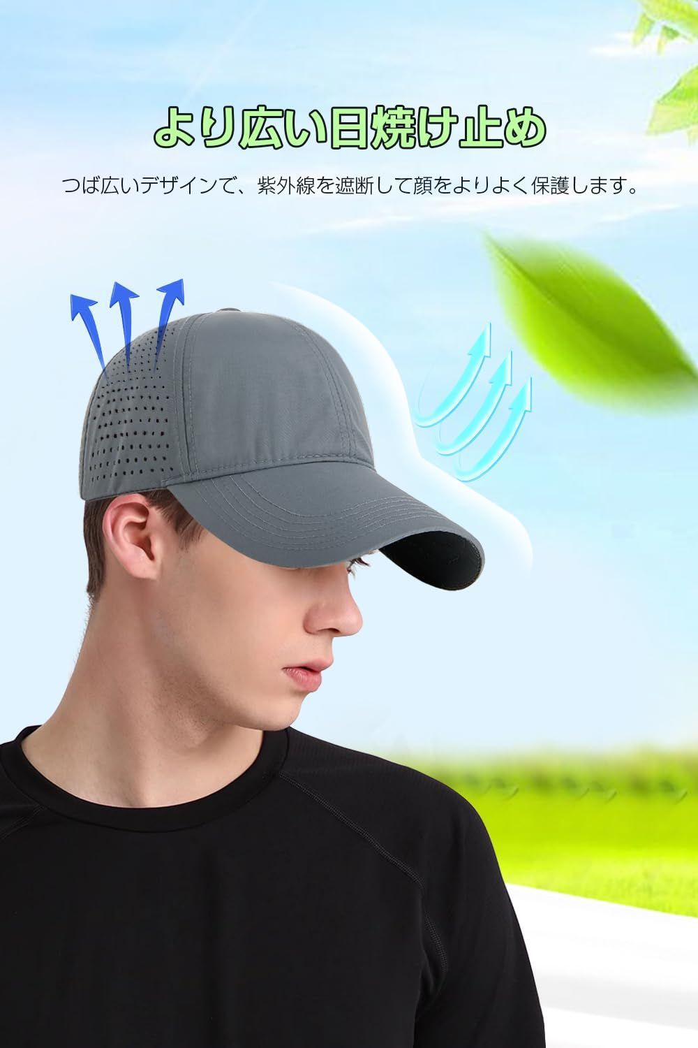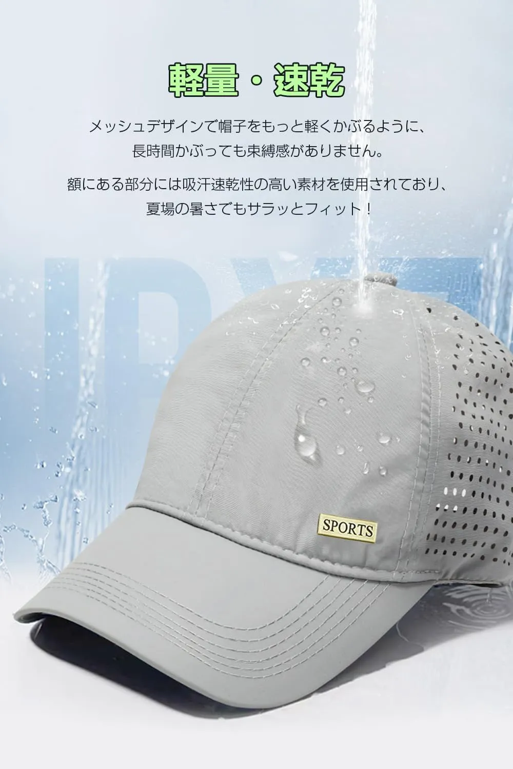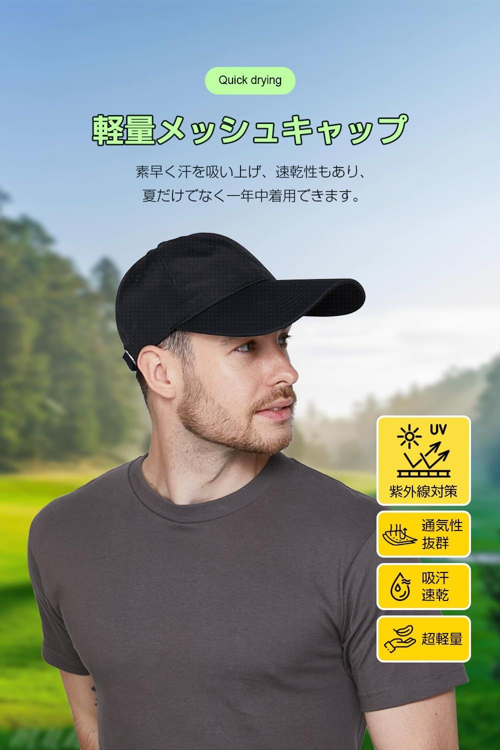 【超軽量で着心地がよい】メッシュデザインで帽子をもっと軽くなってわずか60g、被っていることを忘れてしまうほど軽く、束縛感もなく長時間ストレスがなく着用いただけます。また軽量なので普段からバッグに入れて持ち運ぶのにも負担になりません。