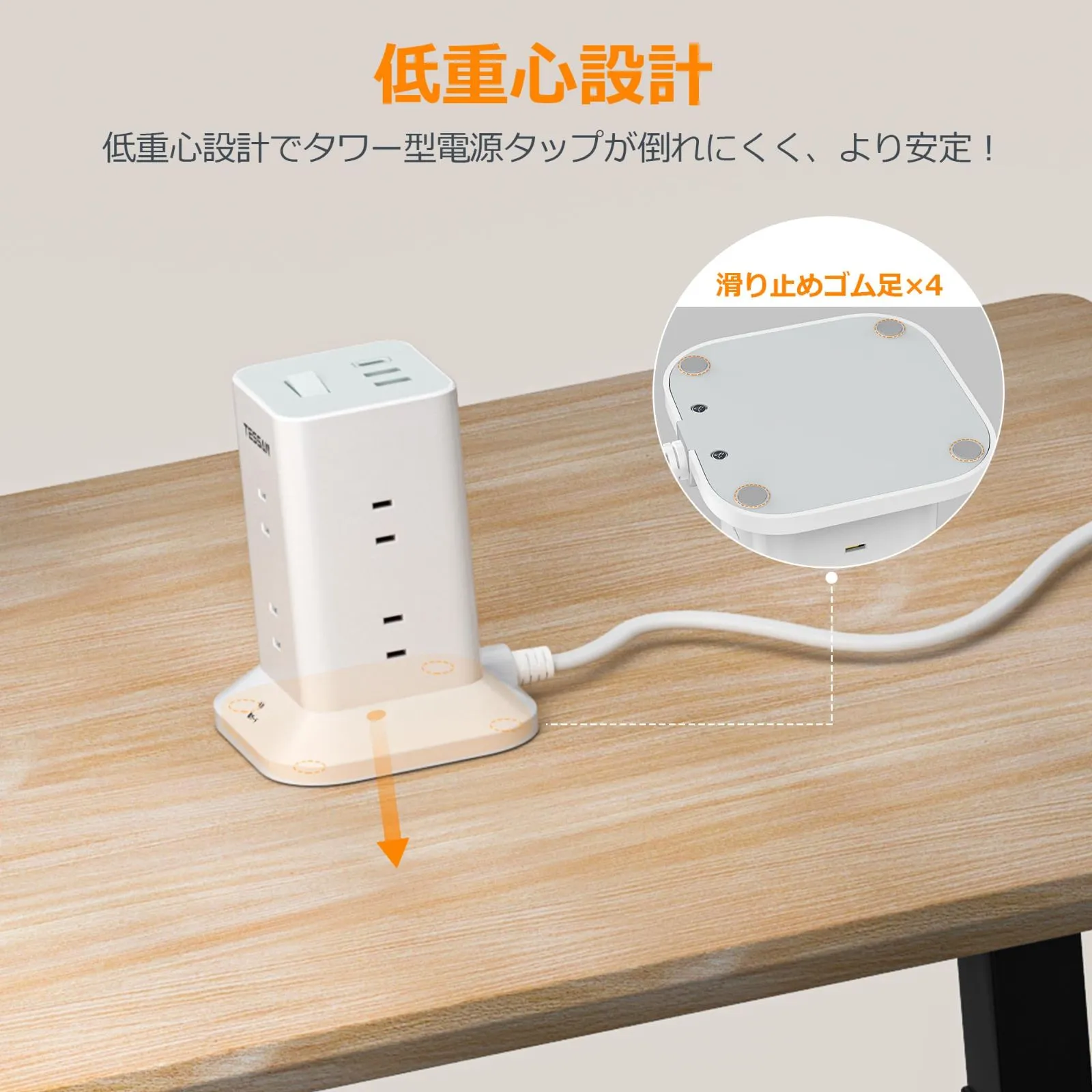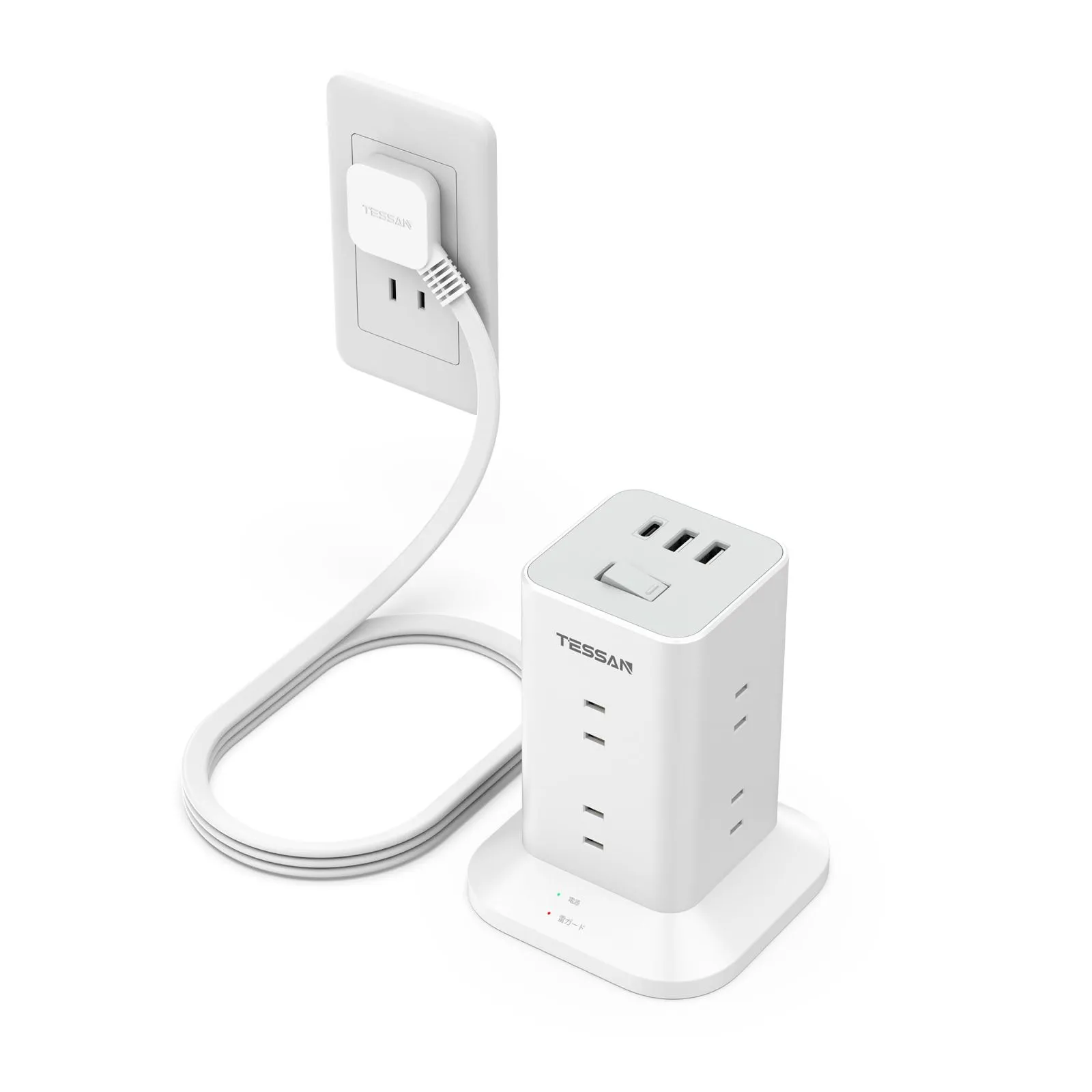 8個AC コンセント 2m 1個USB-Cポート及び2個USB-Aポート TESSAN 延長コード テーブルタップ たこあしコンセント 薄型プラグ タコ足配線 マルチ OA タワー型 雷ガード 一括スイッチ 電源タップ 省エネ mini型