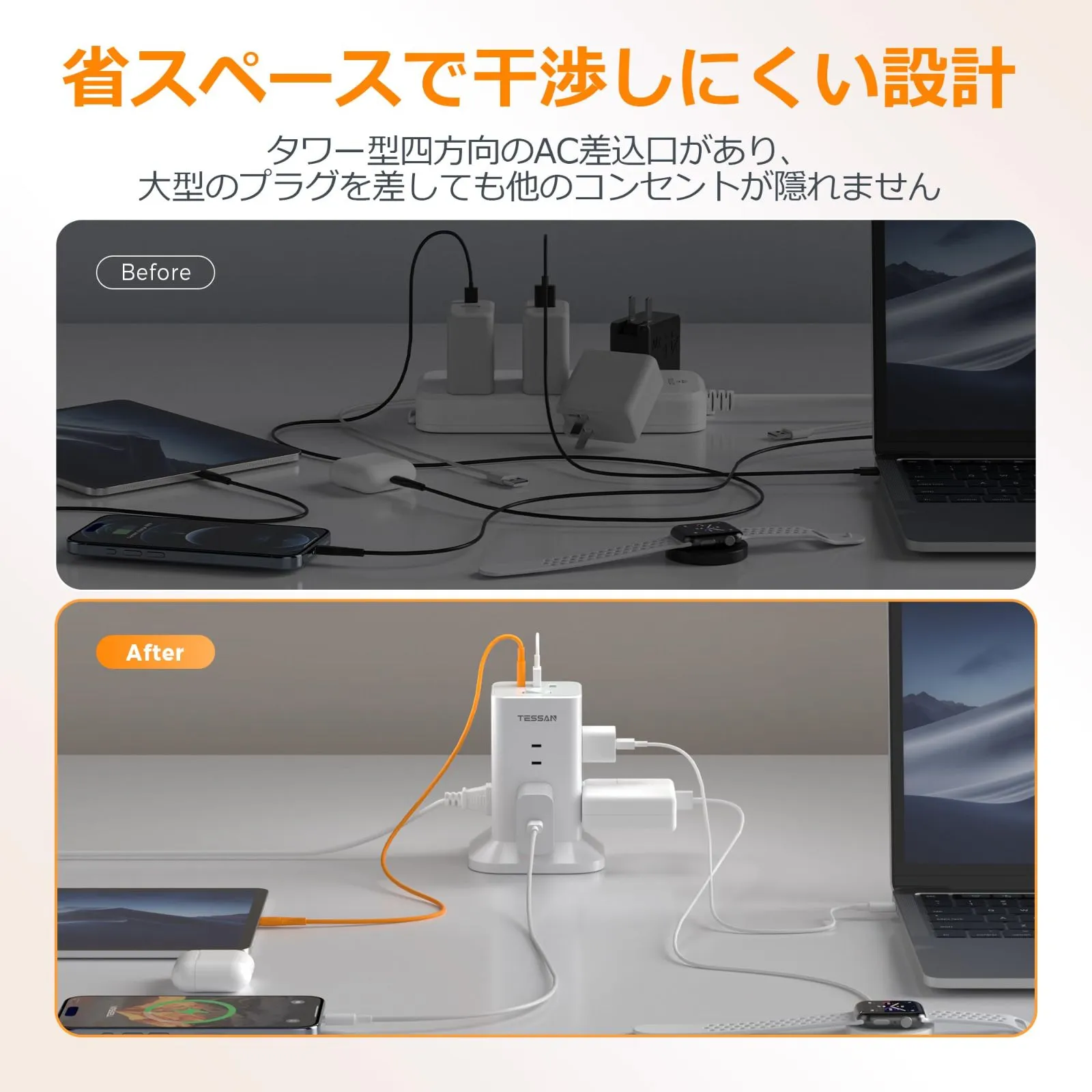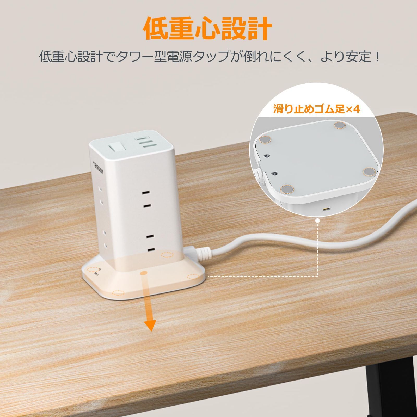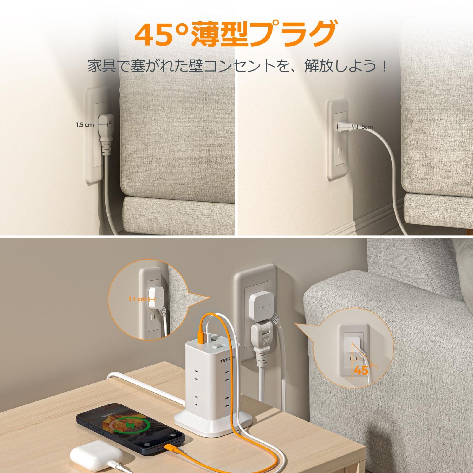 【タワー電源タップmini型】この電源タップは日本のために研究し、設計されていて、一般的なタワー型コンセントより小型でコンパクトです(本体サイズ:僅か10x10x12.7cm)。在宅勤務、オフィス、会議室、学校、寮、パーティーなど様々な使用場所で活用できます。