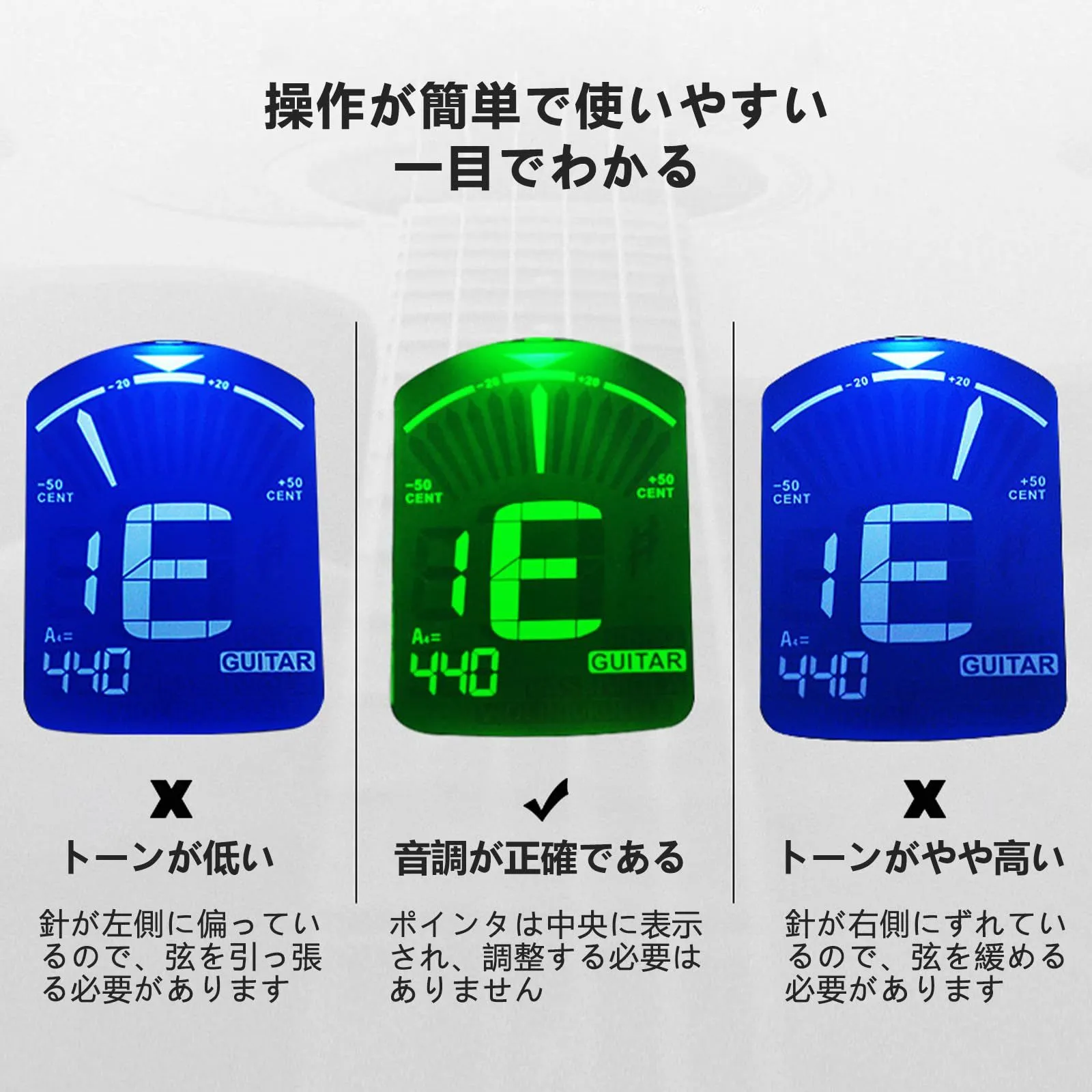 【使用モード】ギターモード調整可能な標準チューニング1E / 2B / 3G / 4D / 5A / 6E、バイオリン標準チューニング4G / 3D / 2A / 1E、ベース標準チューニング1G / 2D / 3A / 4E、ウクレレCのキー:1A / 2E / 3C / 4G、Dのキー:1B / 2F# / 3D / 4A、すべての弦楽器に適していますC / C# / DB / D / D# / ED / E / F /F#/GB、G/G#/AB/A/A#/BB 最後までご確認頂き誠にありがとうございました。 上記をご確認頂き、ご購入いただけましたら幸いです。 何かご不明な点がございましたらお気軽にメッセージからお問い合わせ下さい。