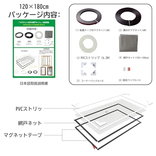 網戸キット マグネット 新型 ネット強化版 DIY 内窓 虫除け 小窓用 簡易網戸 花粉対策 ホコリ対策 取り付け 張り替え (白枠120cm×180cm)★tm