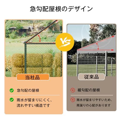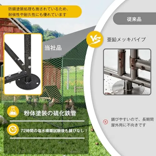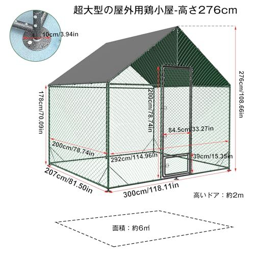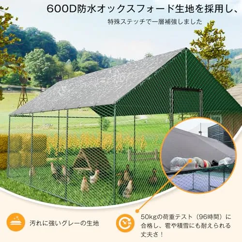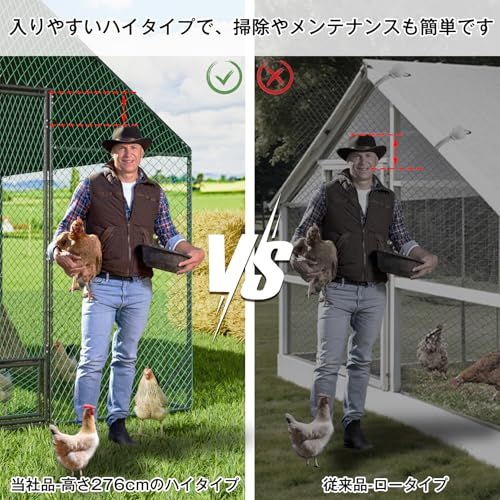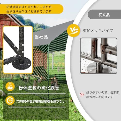 【大きいサイズで、より快適】超大型の屋外用鶏ケージのため、にわとりたちに約6のプレイスペースを与えられ、鶏の屋外養殖に最適です。ご必要により、止まり木や産卵箱なども余裕をもって配置できます