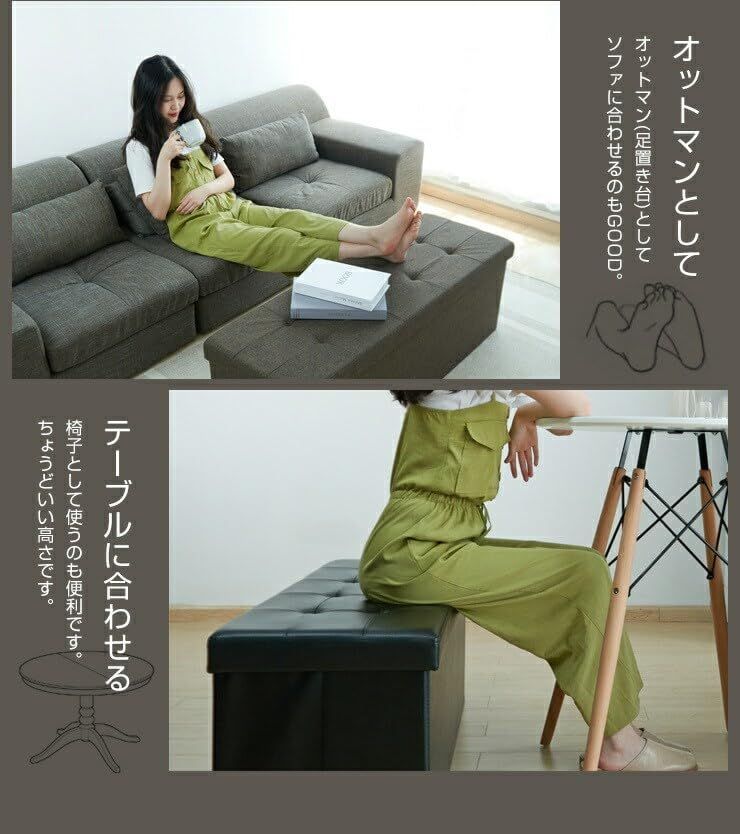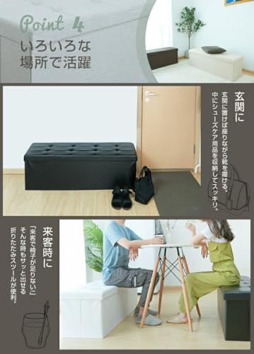 【いろいろな場所で活躍】 玄関に:玄関に置けば座りながら靴を履ける。中にシューズケア用品を収納してスッキリ。 来客時に:「来客で椅子が足りない!」そんな時もサッと出せる折りたたみスツールが便利。 オットマンとして:オットマン(足置き台)としてソファに合わせるのもGOOD。 テーブルに合わせる:椅子として使うのも便利です。ちょうどいい高さです。