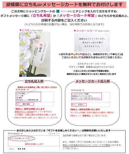 立ち札やメッセージカードのご依頼も承ります。"ギフトの設定"にチェックを入れ、購入画面の"ギフトメッセージ"欄に「立ち札希望」か「メッセージカード希望」のどちらかを記載の上、内容をご入力ください。(入力例は商品画像参照) やややなど、各種絵文字は入力されても印刷されませんのでご注意ください。