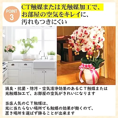 CT触媒加工済で消臭・抗菌・防汚効果や空気を清浄化する作用があります。光触媒と異なり、光が当たらない場所でも効果を発揮するため、飾る場所を選びません。
