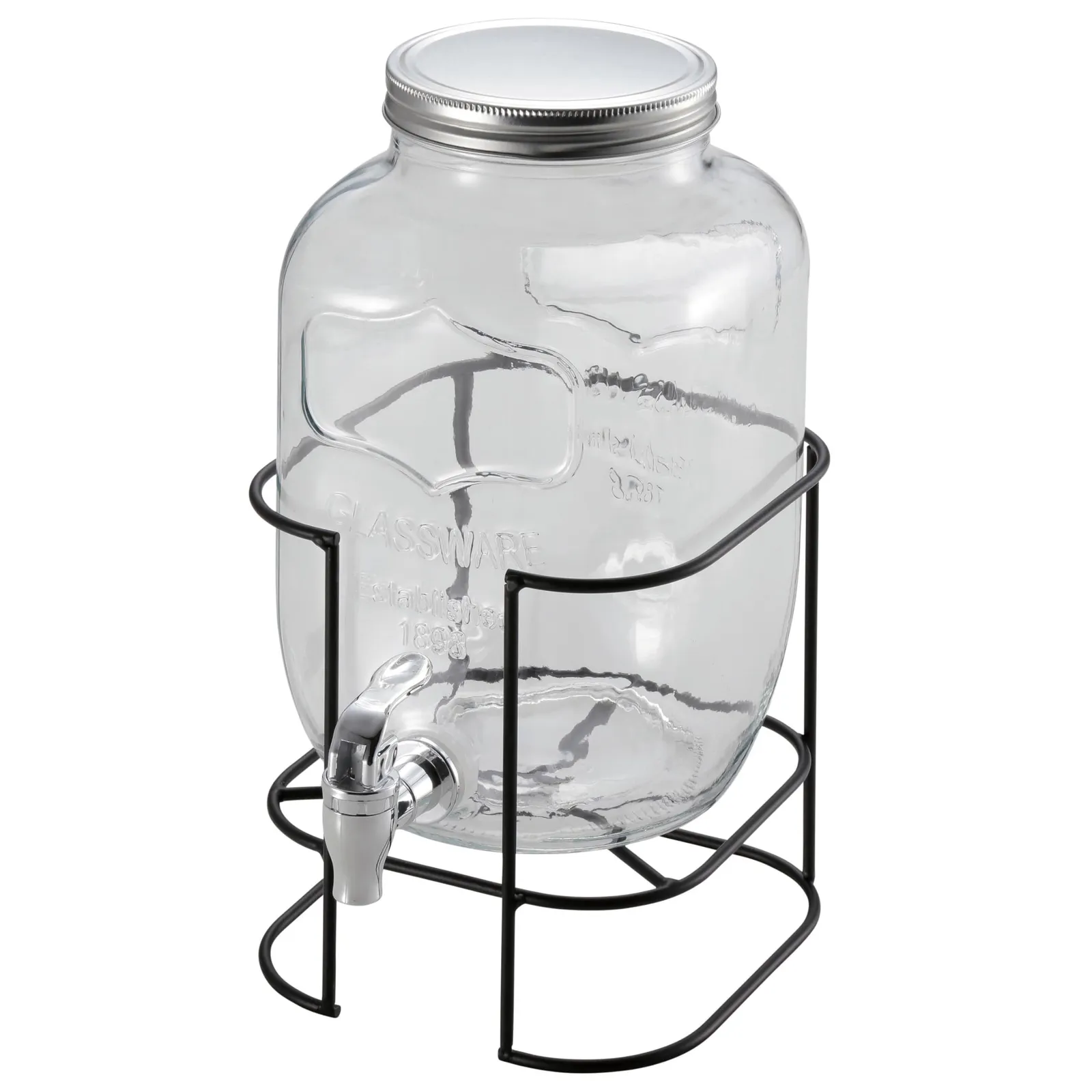 材質:本体/ソーダガラス、フタ/アルミニウム、コック・本体/ポリエチレン、コック・パッキン/シリコーン、スタンド/鉄(紛体塗装)、原産国:中国
