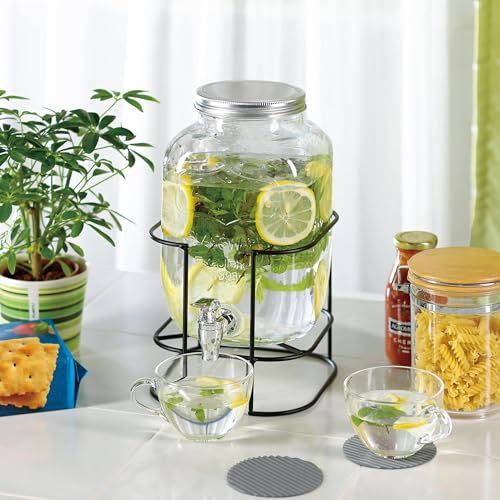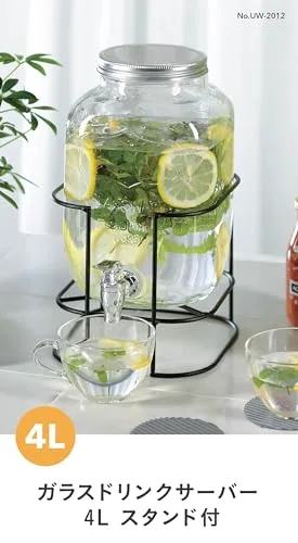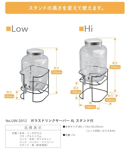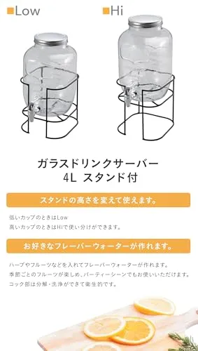 特徴:スタンド付きのガラスドリンクサーバー。スタンドの高さを変えて使えます。低いカップのときはLow、高いカップのときはHiで使い分けができます。お好みなフレーバーウォーターが作れます。ハーブやフルーツなどを入れてフレーバーウォーターが作れます。季節ごとのフルーツが楽しめ、パーティシーンでもお使いいただけます。コック部は分解・洗浄ができて衛生的です。