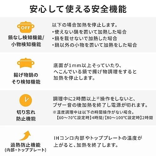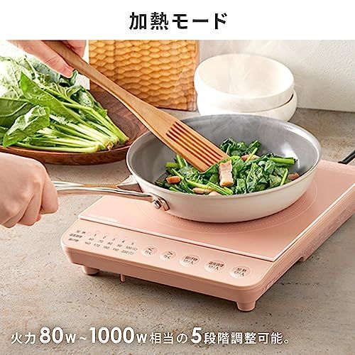 火力調節/加熱:5段階(火力)80W相当、200W相当、500W、700W、1000W/温度調理(約):5段階(水温)60、70、80、90、100/揚げ物調理(約):5段階(油温)160、170、180、190、200