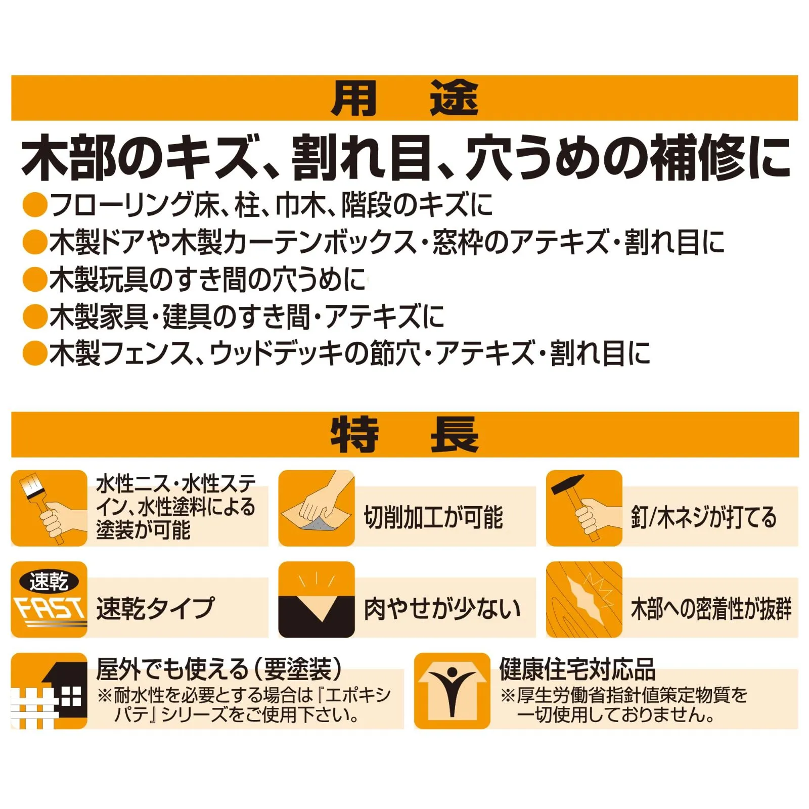 特長:水性、肉やせが少ない、サンディング可能、水性塗料の塗装可能