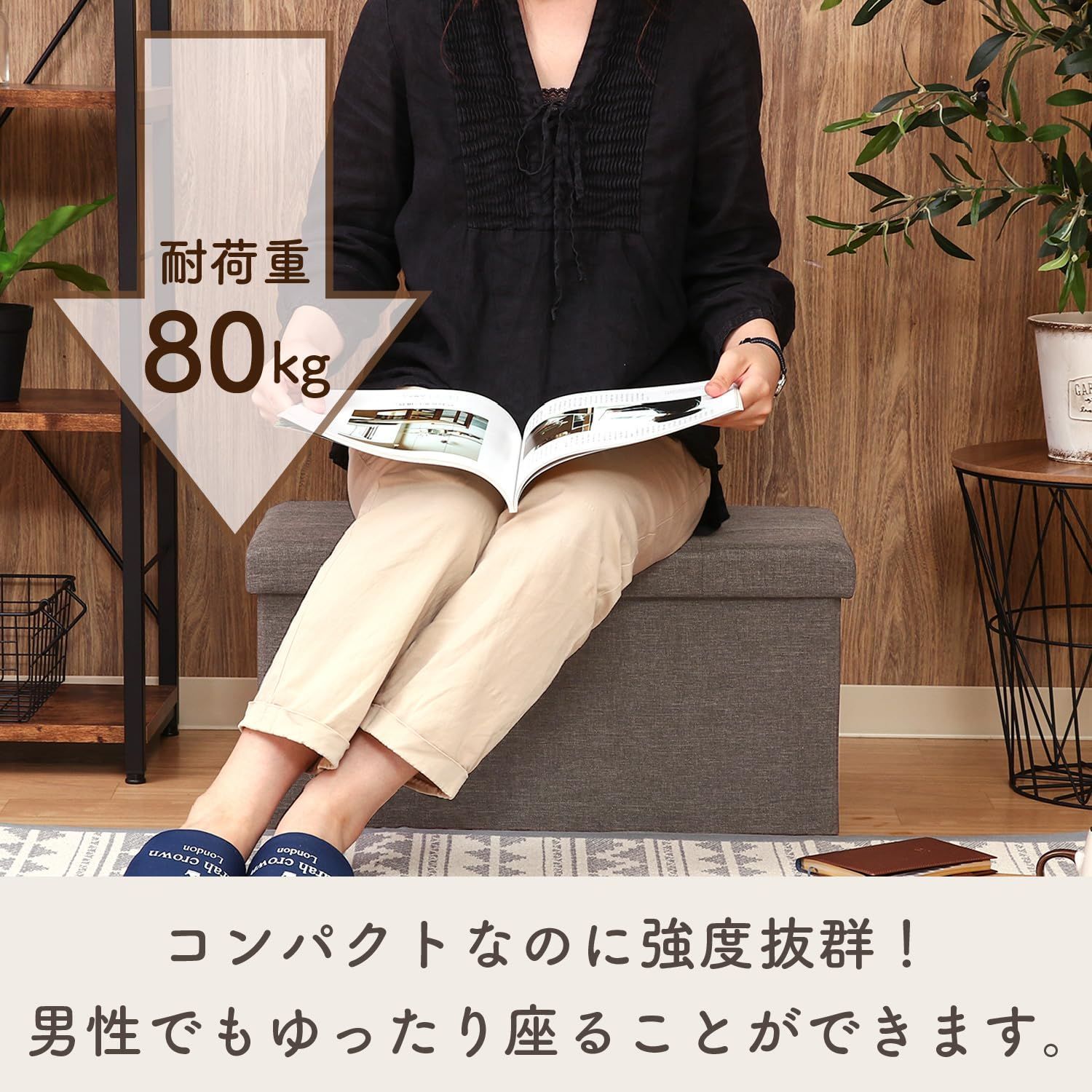 折りたたみ 耐荷重80kg ボックススツール オットマン チャコール ハント 幅60×奥行30×高さ30cm 収納ボックス 86140 収納ベンチ 不二貿易(Fujiboeki)