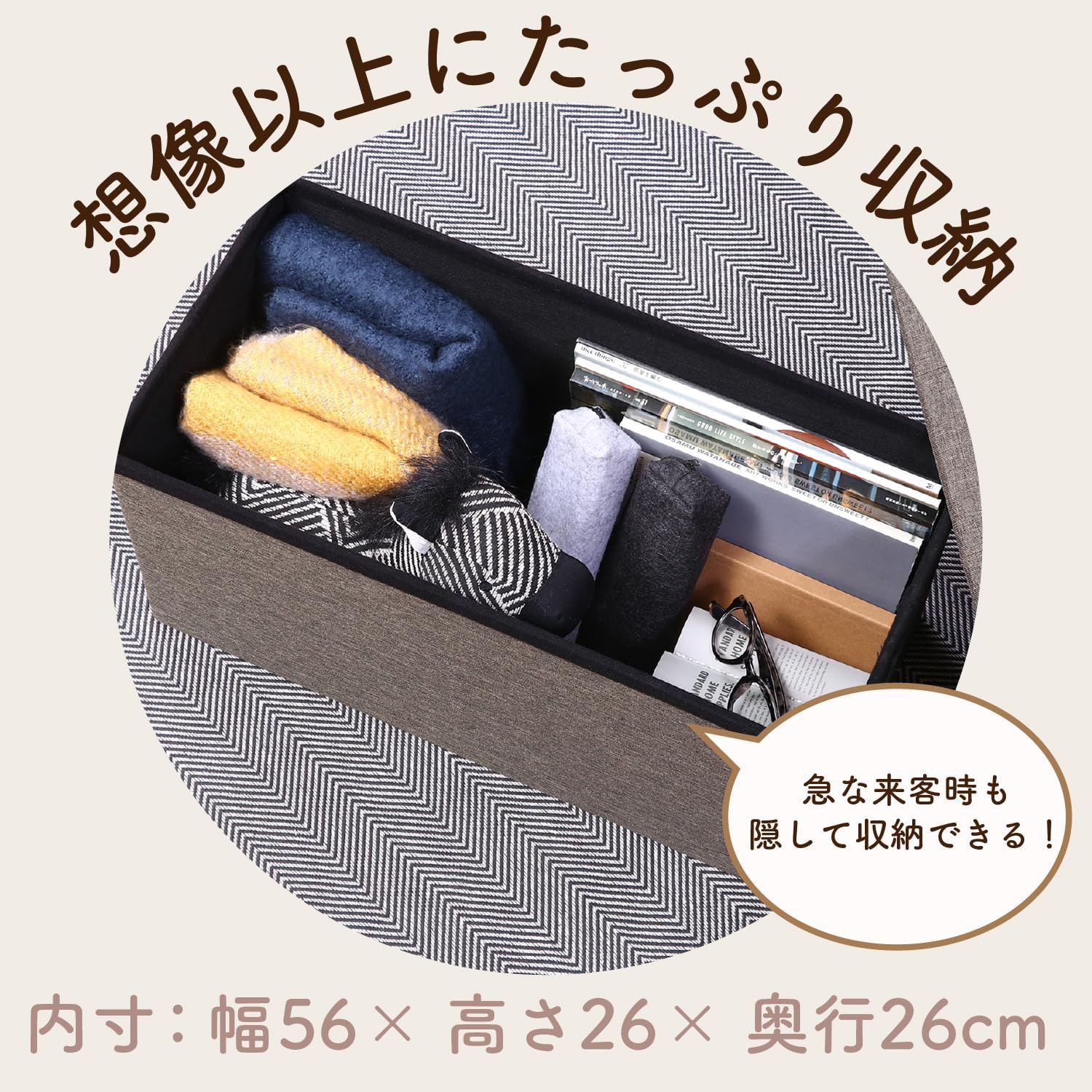 座面下の収納スペースに、生活感の出る雑貨や本などを収納できます。