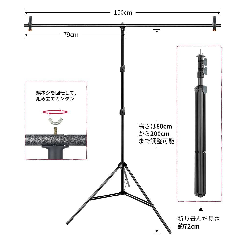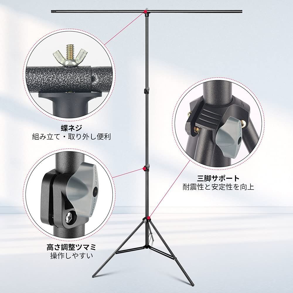 【プロなT字型背景スタンド】背景スタンドは艶消しスチール材質、頑丈で耐久性があり、傷付けやすくないです。ライトスタンドの高さは80cmから200cmまで調整可能です。