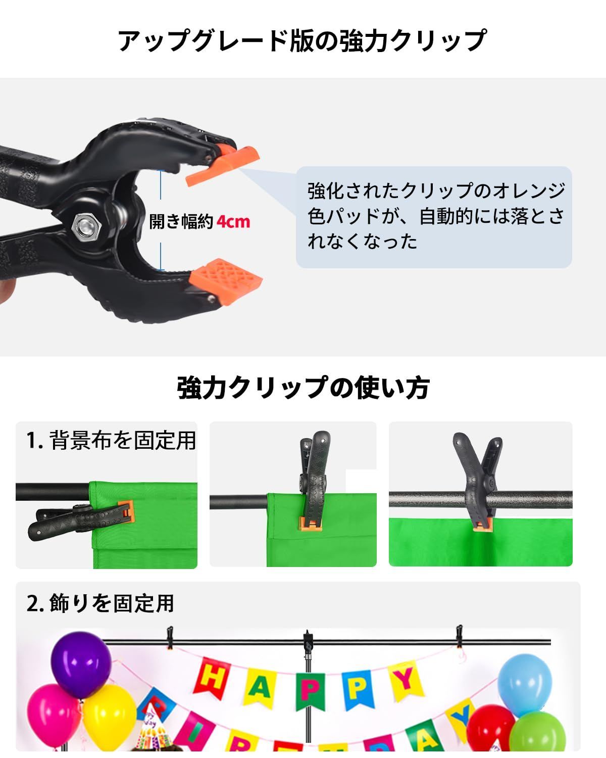 【背景クリップ付き】4つの超強力背景布のクリップが付き、背景シートや背景紙などしっかりと撮影スタンドに固定可能です。
