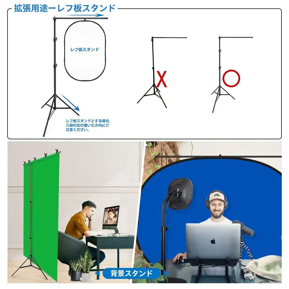 【クロスバー2本付き】クロスバーは単独でも組み合わせでも使用でき、幅は79㎝と152cmを選択可能です。 撮影スタンドだけではなく、レフ板スタンドとしても使え、照明リフレクター、レフ板、背景布などを固定することができます。(注意:クロスバーを1本だけ使用する場合は、力学に基づいて、バランスを取れるために、三脚の足の置いた方向に注意する必要があります。詳しく図3でご参考ください。)