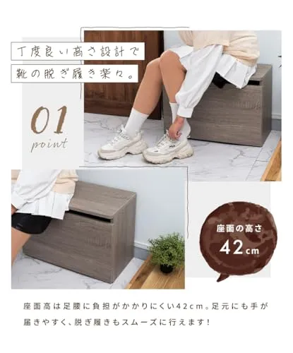 【腰掛に丁度良い高さ】 座面高は42cmと靴を脱ぎ履きするのにちょうどよい高さ。履きづらいロングブーツやヒールを楽な体勢で履くことができます。ご高齢の方にもおススメできます
