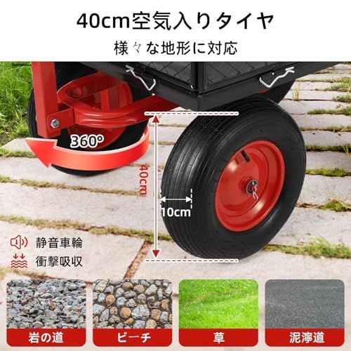 【大型タイヤで不整地も安定移動】 太くて大きな40cm空気入りタイヤを採用。弾力性と耐衝撃性に優れ、柔らかい土の上や草むら、砂利道など、従来のカートでは進みにくかった場所でも安定した滑らかな移動が可能。荷物が揺れにくく、落ちる心配も軽減します。