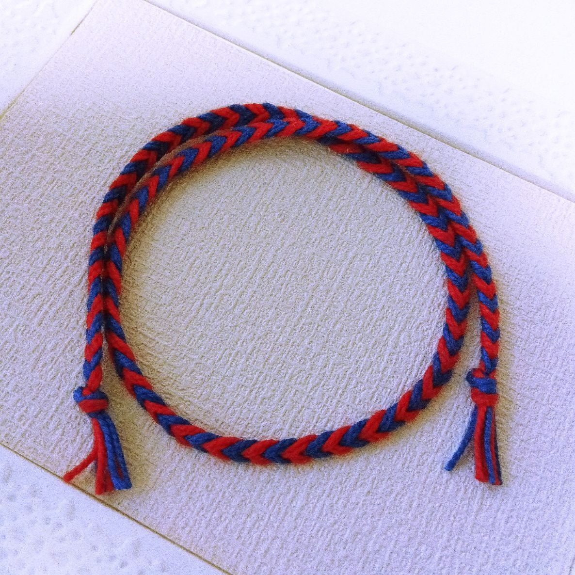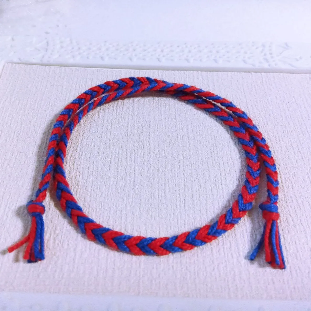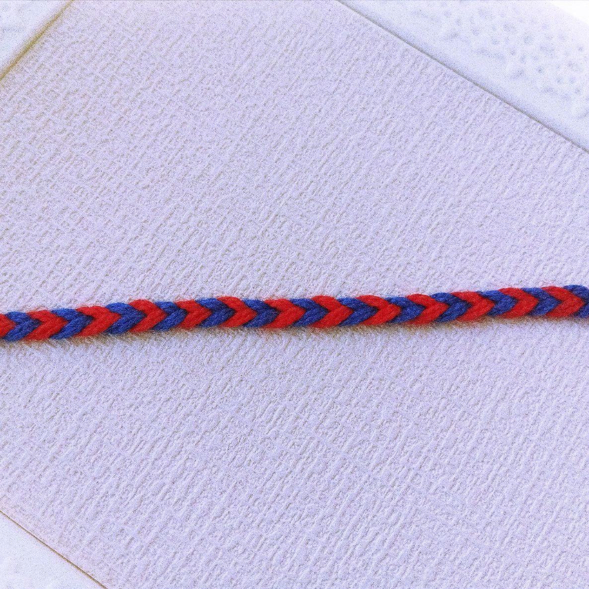 ブルーとレッドの5番手刺繍糸で、フィッシュボーンの編み方でアンクレット ミサンガを制作しました。