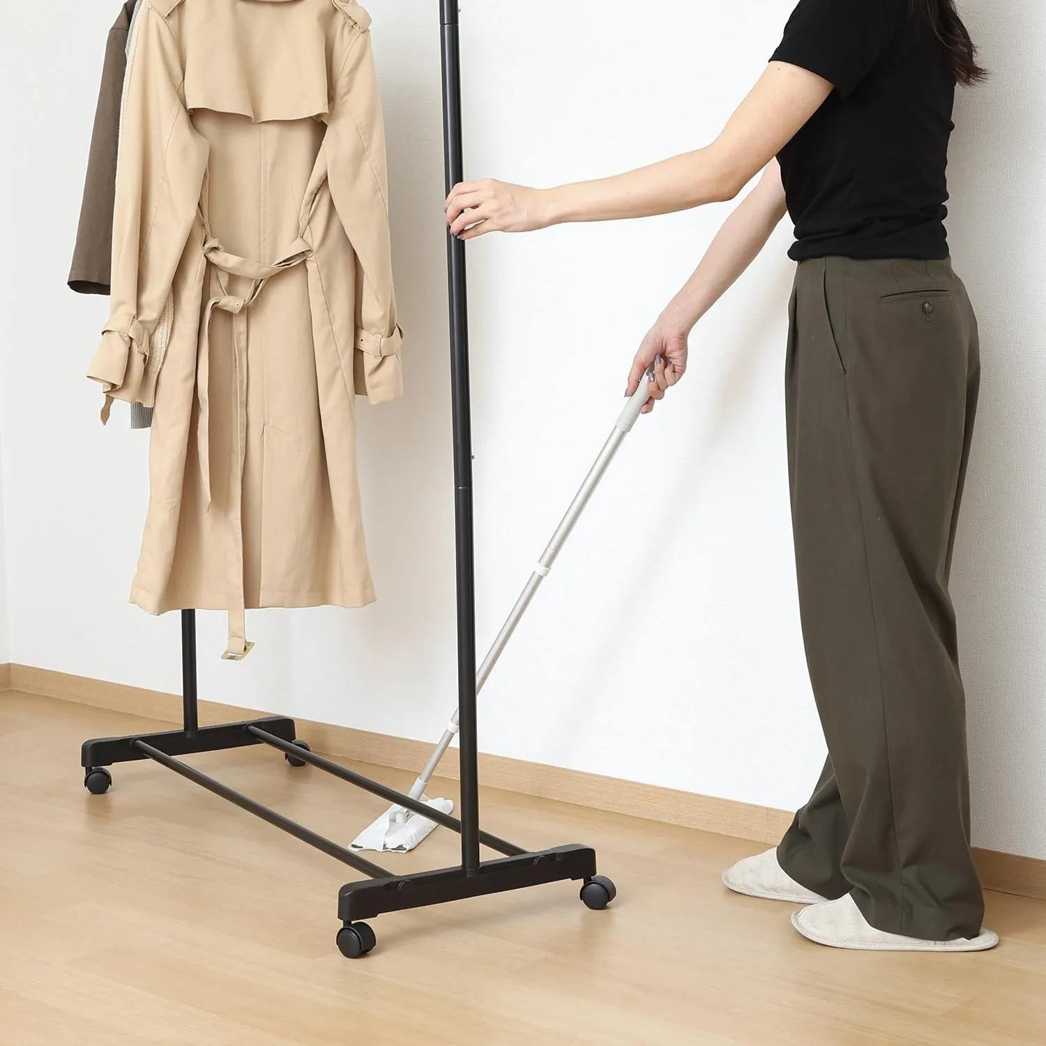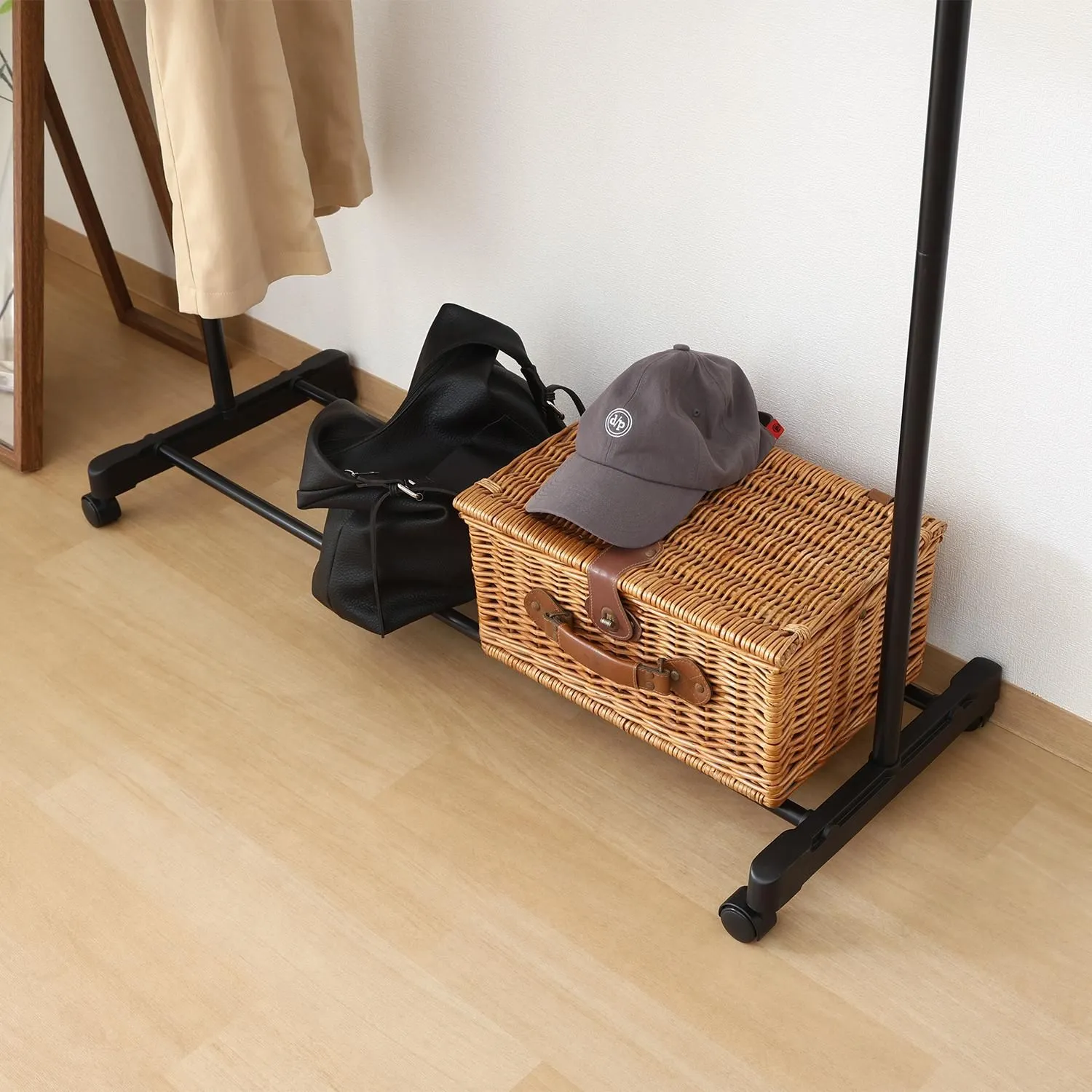 ハンガー下のスペースにはバッグや収納ボックスを置けるラック付き。