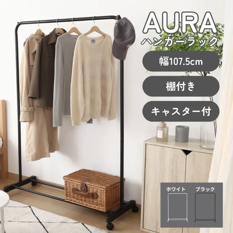 インテリアに馴染むハンガーラックAURA ワイド キャスター付 棚付き リビング 衣類収納 コンパクト 組立簡単 4003