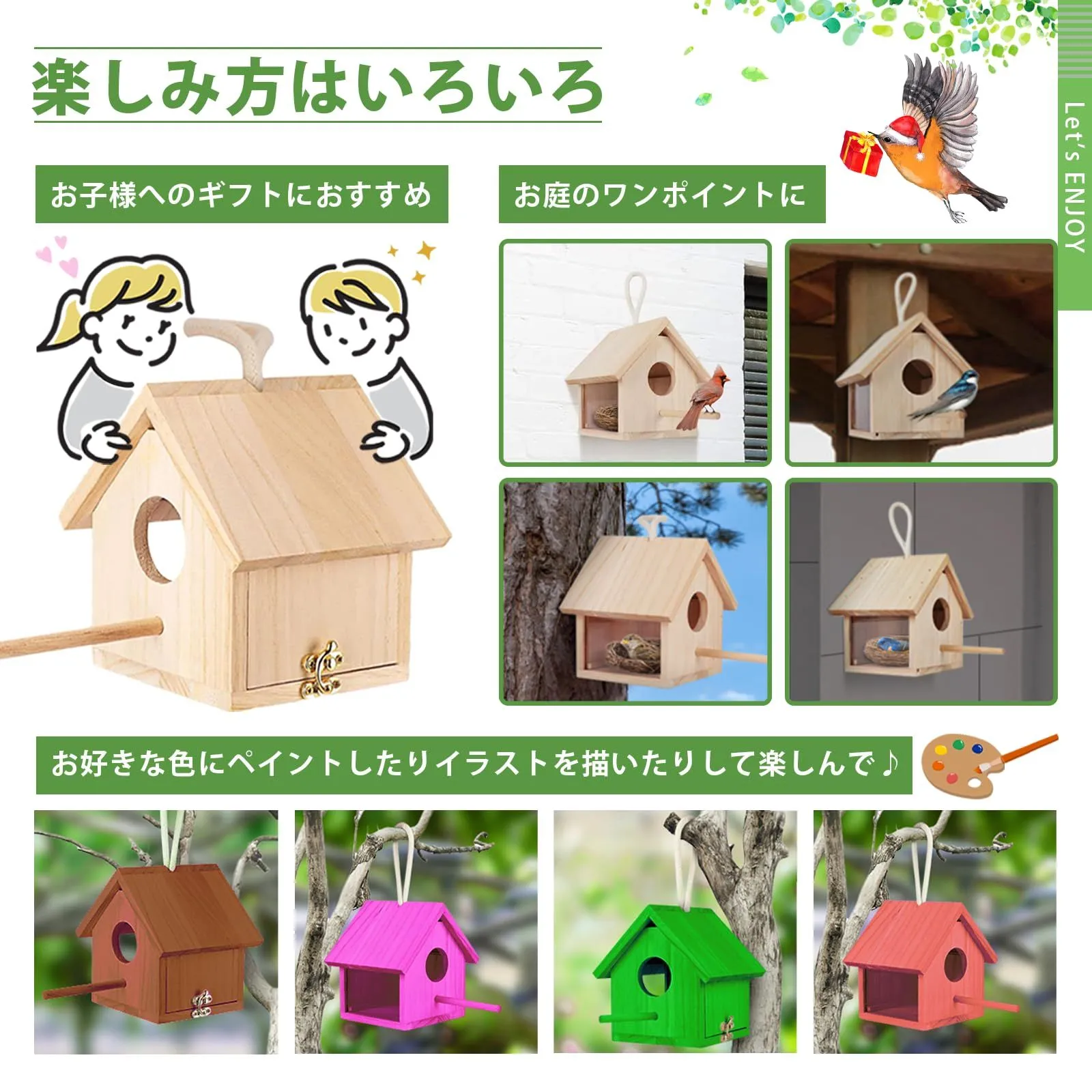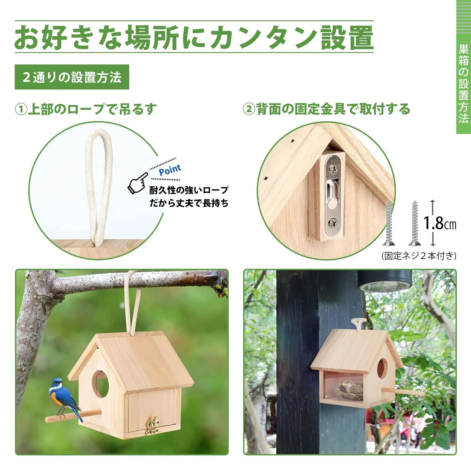【野鳥用巣箱】 アクリル 鳥小屋 バードハウス 完成品 吊り下げ 木製 野鳥観察 鳥の巣 巣箱 野鳥 屋外 バードウォッチング サイズ:11cm x 11cm x 14cm 三角屋根タイプのかわいい巣箱の完成品となります。 アクリルの観察窓付き。開けなくても外から中の様子を確認することができます。 側面にはロック付きの扉がついており中のお手入れもしやすいです。 背面をねじで固定したり、吊り下げたり様々な取り付け方が可能です。 天然木材を使用し環境にやさしく、耐久性に優れています。 片面がアクリル素材のため開けなくても中の様子を確認することができるタイプの巣箱となっています。 庭先や公園など様々な場所に簡単に取り付けることができます。 使用方法 巣箱は人の出入りの少ない1.5m以上の高さに設置することをおすすめします。 最後までご確認頂き誠にありがとうございました。 上記をご確認頂き、ご購入いただけましたら幸いです。 何かご不明な点がございましたらお気軽にメッセージからお問い合わせ下さい。