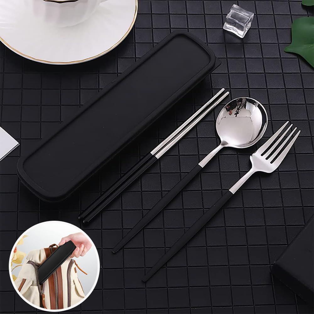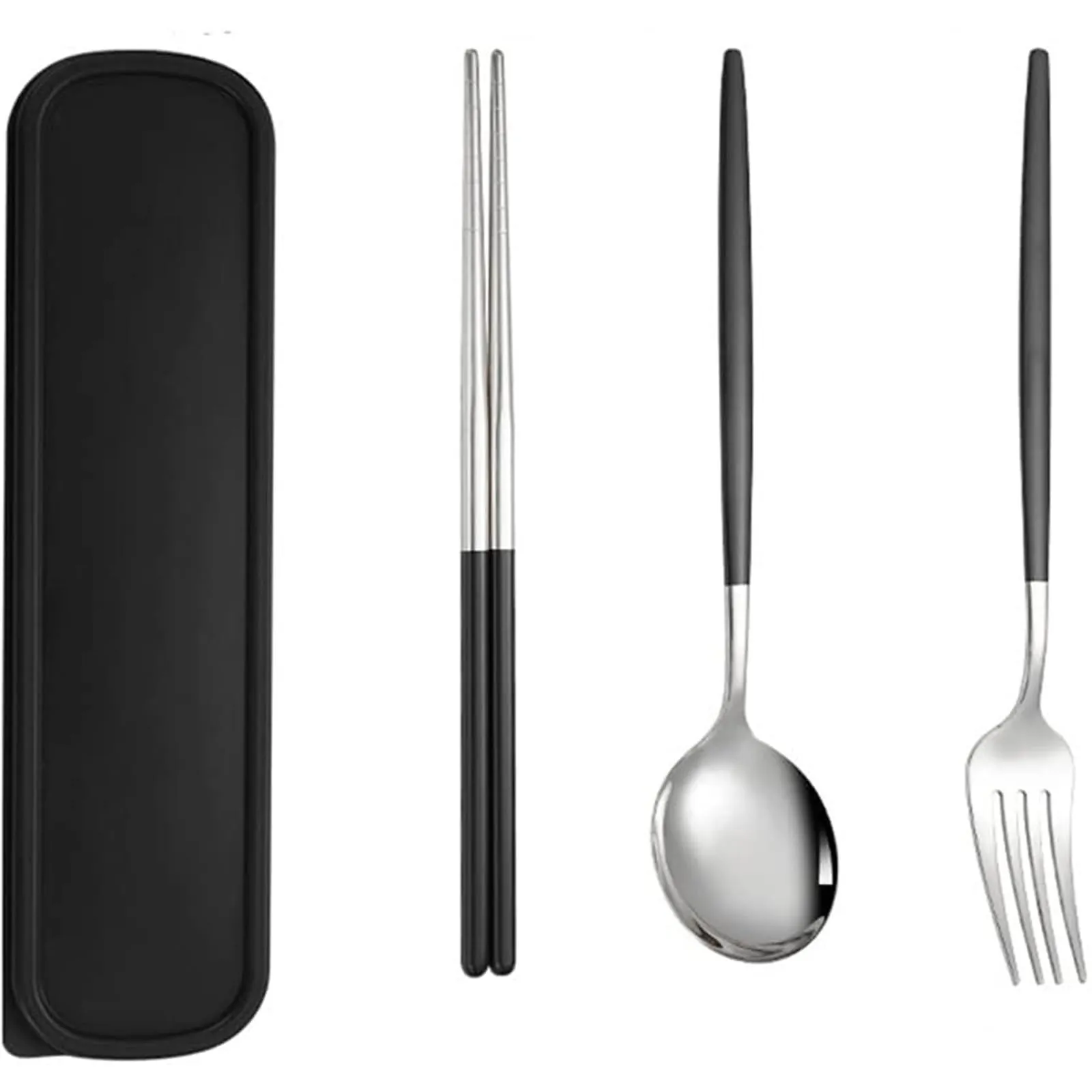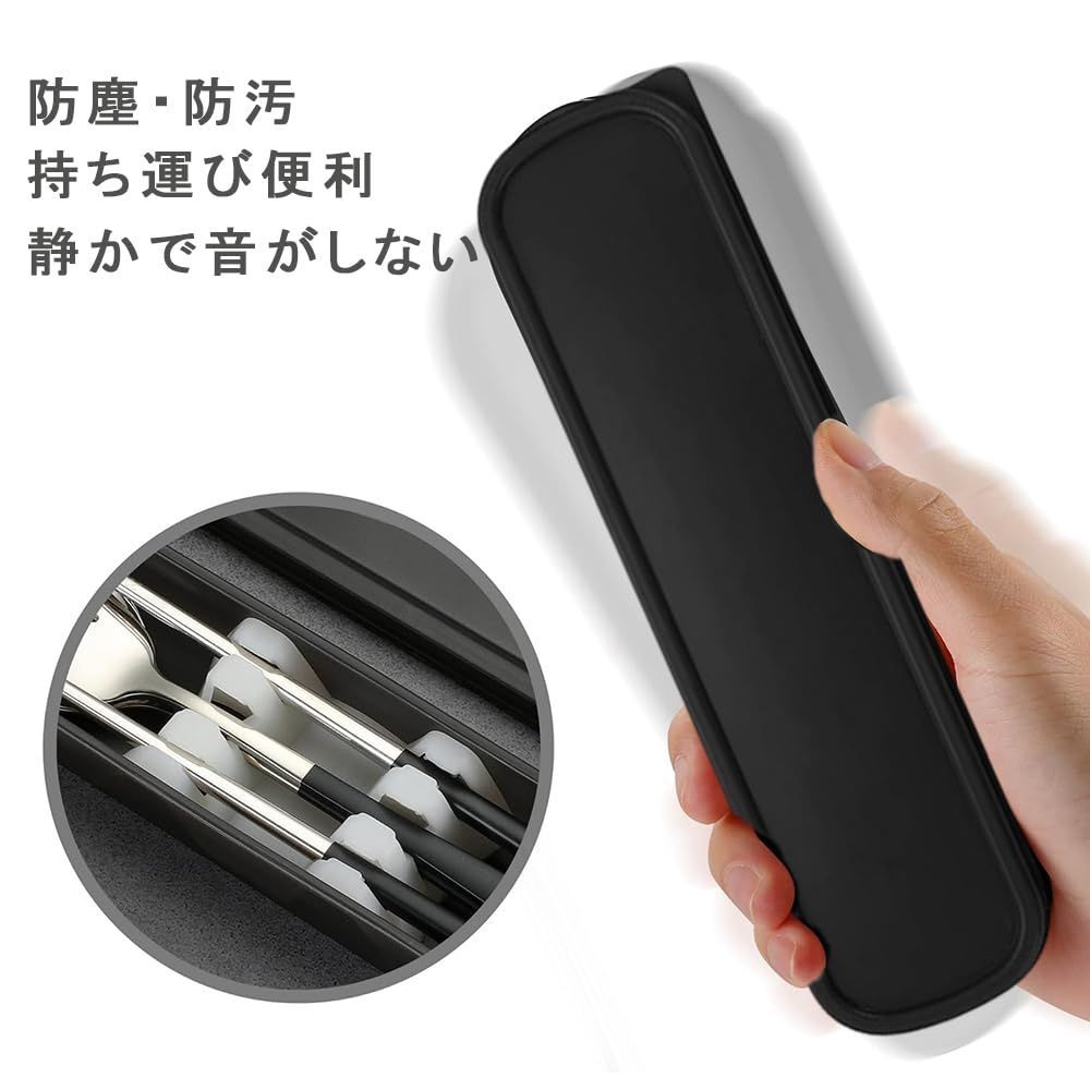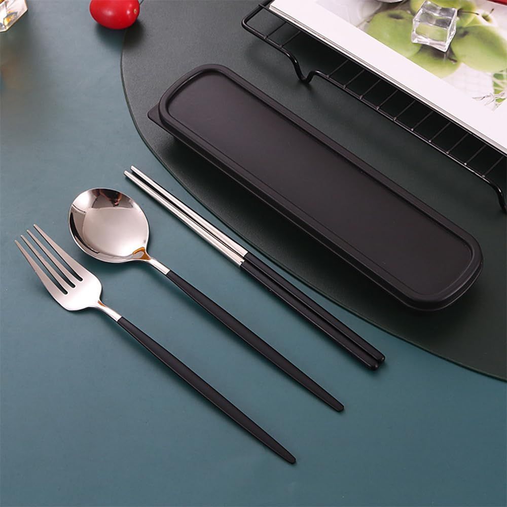 KALOLINNA カトラリーセット ステンレス鋼 箸 スプーン フォーク 3点セット ケース付き 食器セット軽量 通勤 通学 遠足 携帯便利 弁当箱用 キャンプ用(ブラックシルバー)