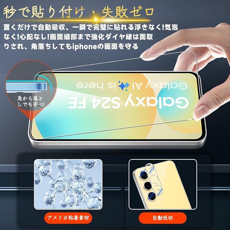 【専用設計・簡単に貼り付け】Galaxy s24 FE 5G 専用液晶画面保護ガラスフィルム。 本商品は日本素材のAGC 旭硝子 素材を採用して作られております。 フィルムのシリコン自己吸着層により、スチールフィルムを携帯電話に合わせて軽く置くだけで、気泡が入らないように簡単に取り付けられます。 (重点説明:フロントカメラのカメラ穴についてですが、ほこり・異物などの堆積を防止するため、ガラスフィルムにカメラ穴を開けていません。Seninhiのガラスフィルム 、通過率は99.9%なので、フロントカメラの正常使用に全く影響が出ません。) *モデルによってサイズが異なりますので、モデルを確認してご購入ください。