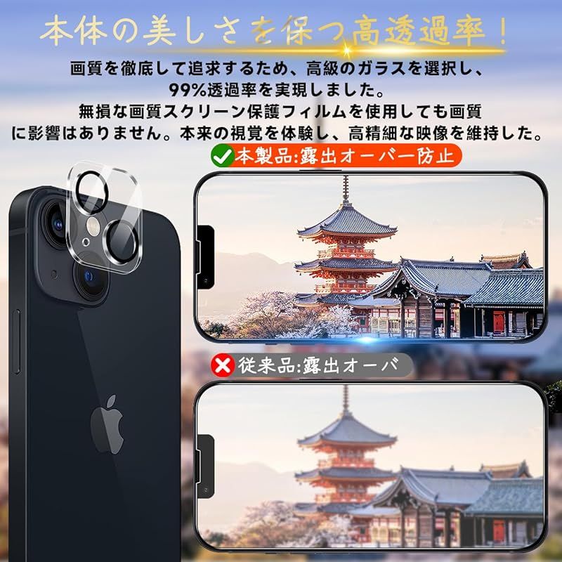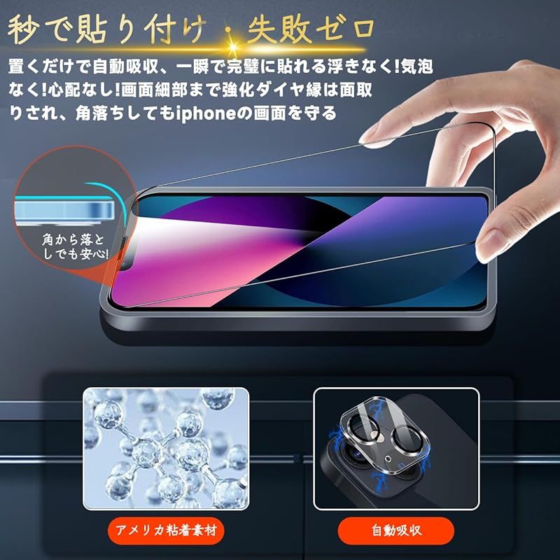 【高品質の材料の9H硬度】 とレンズ保護フィルムはすべて旭硝子で作られており、スマホ保護フィルムの中で最高レベルの9H硬度に達しています、4.5時間以上の高温焼入れ処理を行い、スクリーンプロテクターの圧強度は 125mpa に達し、通常 ガラス の 5 倍になりました。しかもスクリーンプロテクターは衝撃を抑えるシリコンコーティングを内蔵しており、万が一ガラスが割れても、ガラスの破片が飛散しません。ハードコーティング技術は、衝撃を最小限に抑えて画面の破損を抑え、すり傷防止や指紋防止もしっかりとスクリーンを保護します。 *大切な携帯電話の液晶画面を保護し、衝撃や表面のキズを防止します。