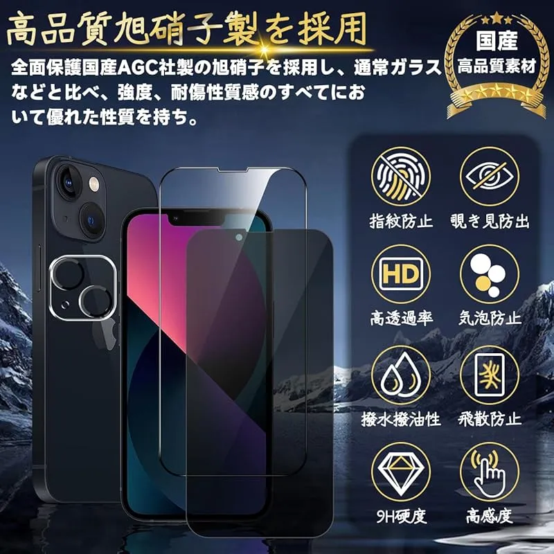 対応 iPhone 13 mini ガラスフィルム apple iphone 13 mini ガイド枠付き 指紋防止 【1*覗き見防止 フィルム+1*クリア フィルム+2* レンズ保護フィルム+ 1*ガイド枠付き】国産旭硝子材質 アイフォン13ミニ 薄型 0