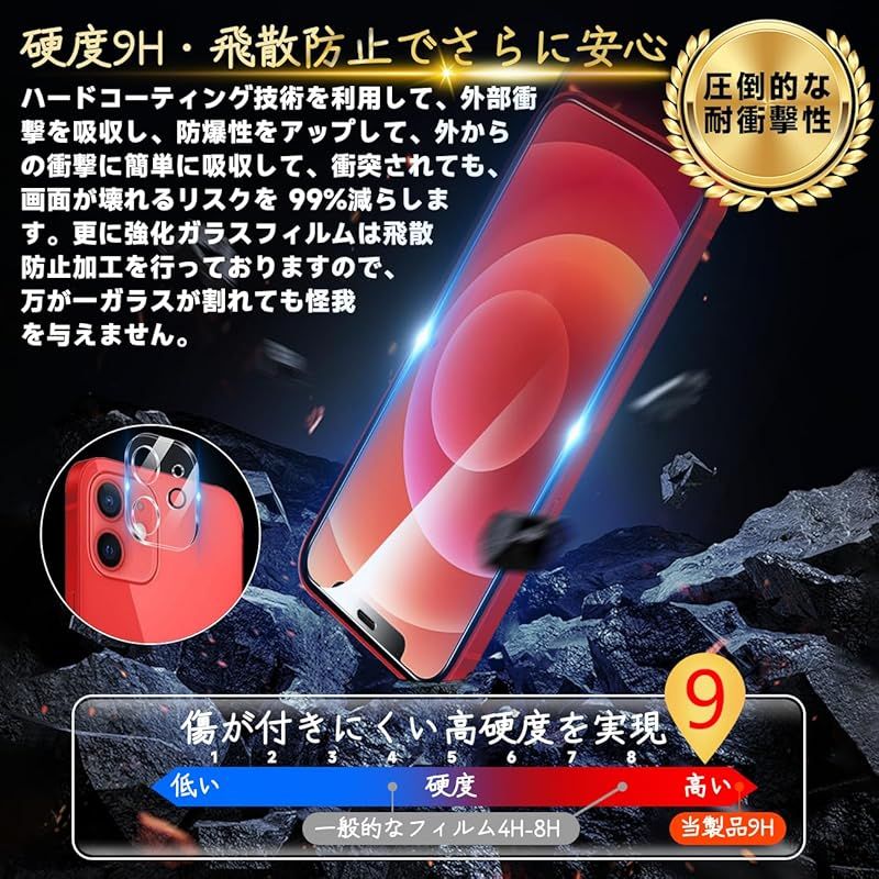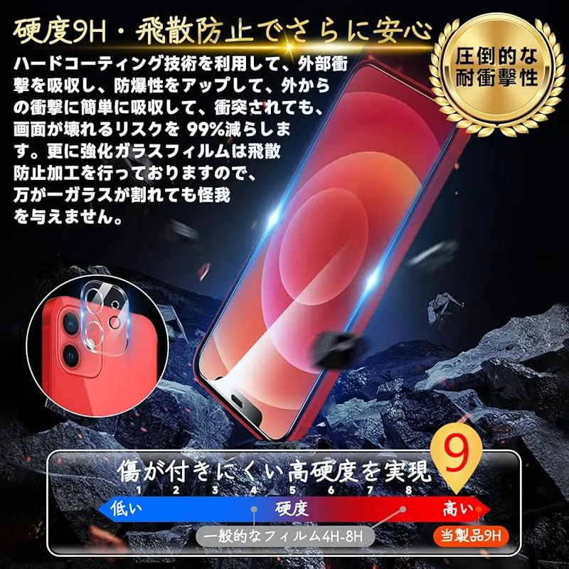 【高品質材質・9H硬度】 ガラスフィルムとレンズ保護フィルムはすべて旭硝子で作られており、スマホ保護フィルムの中で最高レベルの9H硬度に達します。しかも4.5時間以上の高温焼入れ処理を行い、スクリーンプロテクターの圧強度は125mpaに達し、通常 ガラス の 5 倍になりました。スクリーンプロテクターは衝撃を抑えるシリコンコーティングを内蔵しており、万が一ガラスが割れても、ガラスの破片が飛散しません。ハードコーティング技術は、衝撃を最小限に抑えて画面の破損を防止し、すり傷防止や指紋防止もしっかりしております。*大切な携帯電話の液晶画面を保護し、衝撃や表面のキズを防止します。