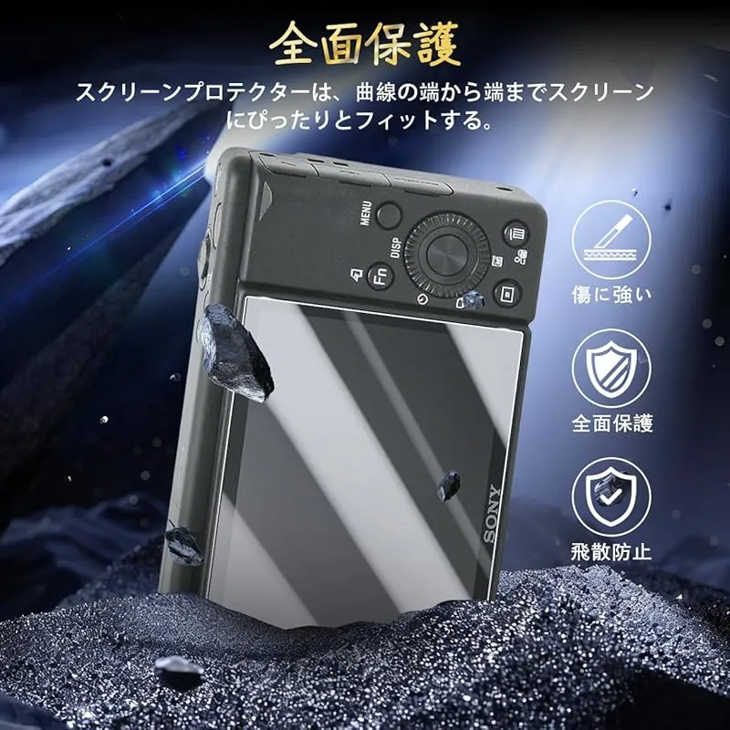【高品質の材料の9H硬度】SONY ZV-E10 とレンズ保護フィルムはすべて旭硝子で作られており、スマホ保護フィルムの中で最高レベルの9H硬度に達しています、4.5時間以上の高温焼入れ処理を行い、スクリーンプロテクターの圧強度は 125mpa に達し、通常 ガラス の 5 倍になりました。しかもスクリーンプロテクターは衝撃を抑えるシリコンコーティングを内蔵しており、万が一ガラスが割れても、ガラスの破片が飛散しません。ハードコーティング技術は、衝撃を最小限に抑えて画面の破損を抑え、すり傷防止や指紋防止もしっかりとスクリーンを保護します。*大切な携帯電話の液晶画面を保護し、衝撃や表面のキズを防止します。