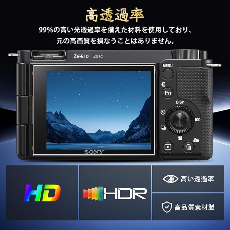 【専用設計・簡単に貼り付け】 本製品 SONY ZV-E10 専用液晶画面保護ガラスフィルムです。本商品は厳選した素材を採用して作られており、フィルムのシリコン自己吸着層があるので、スチールフィルムを携帯電話に合わせて軽く置くだけで、気泡が入らないように簡単に取り付けられます。(ポイント:フロントカメラのカメラ穴についてですが、ほこり・異物などの堆積を防止するため、ガラスフィルムにカメラ穴を開けていません。Seninhiのガラスフィルム 、透過率は99.9%なので、フロントカメラの正常使用に全く影響がありません。)*機種によってサイズが異なりますので、ご購入の場合に機種をよく確認してください。