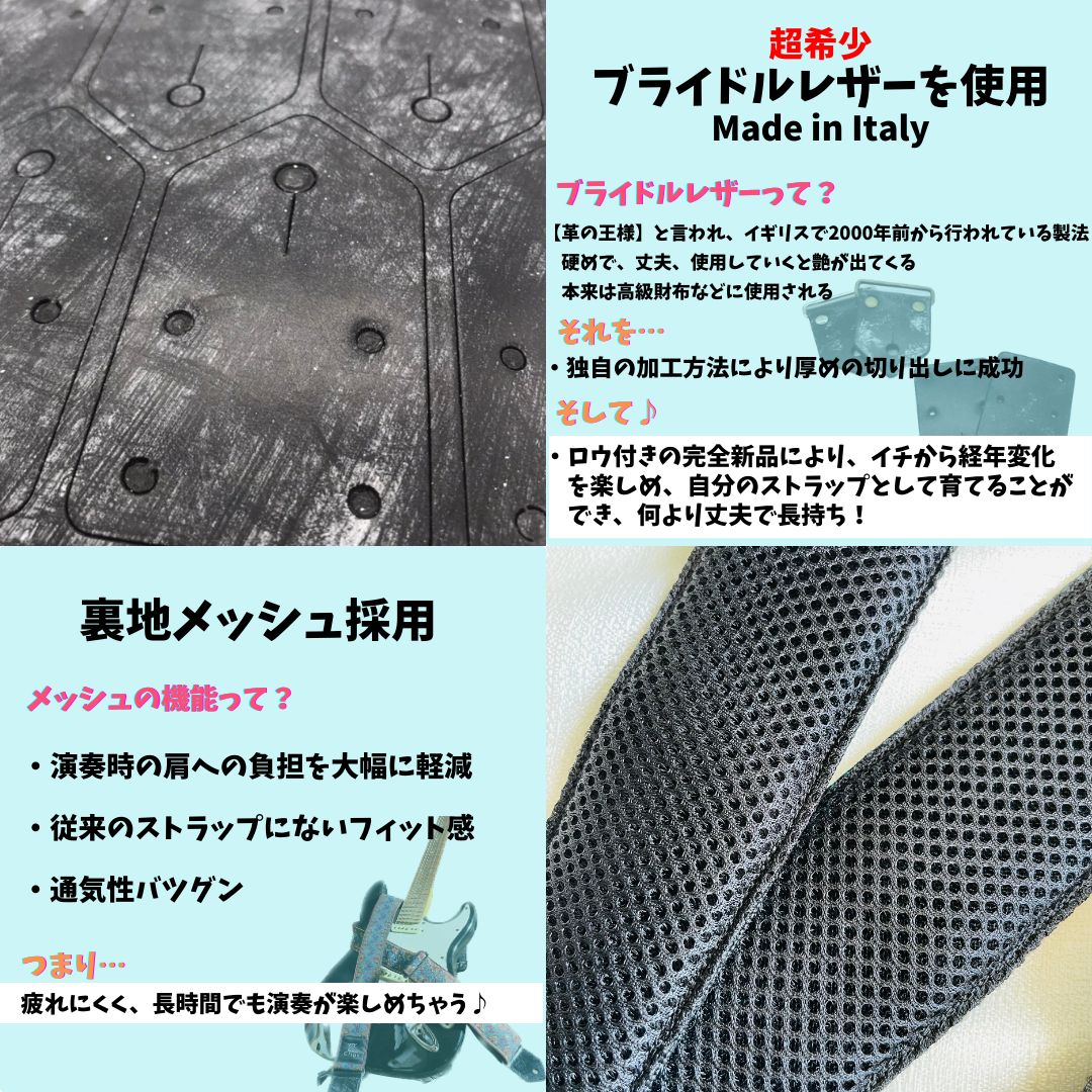 ※イタリア製の大変丈夫なレザーを使用しておりますのでJim Dunlop製、Schaller製のロックピンをご使用予定の場合は穴を拡張致します。ご購入後にメッセージにてご案内致しますのでお伝えください。