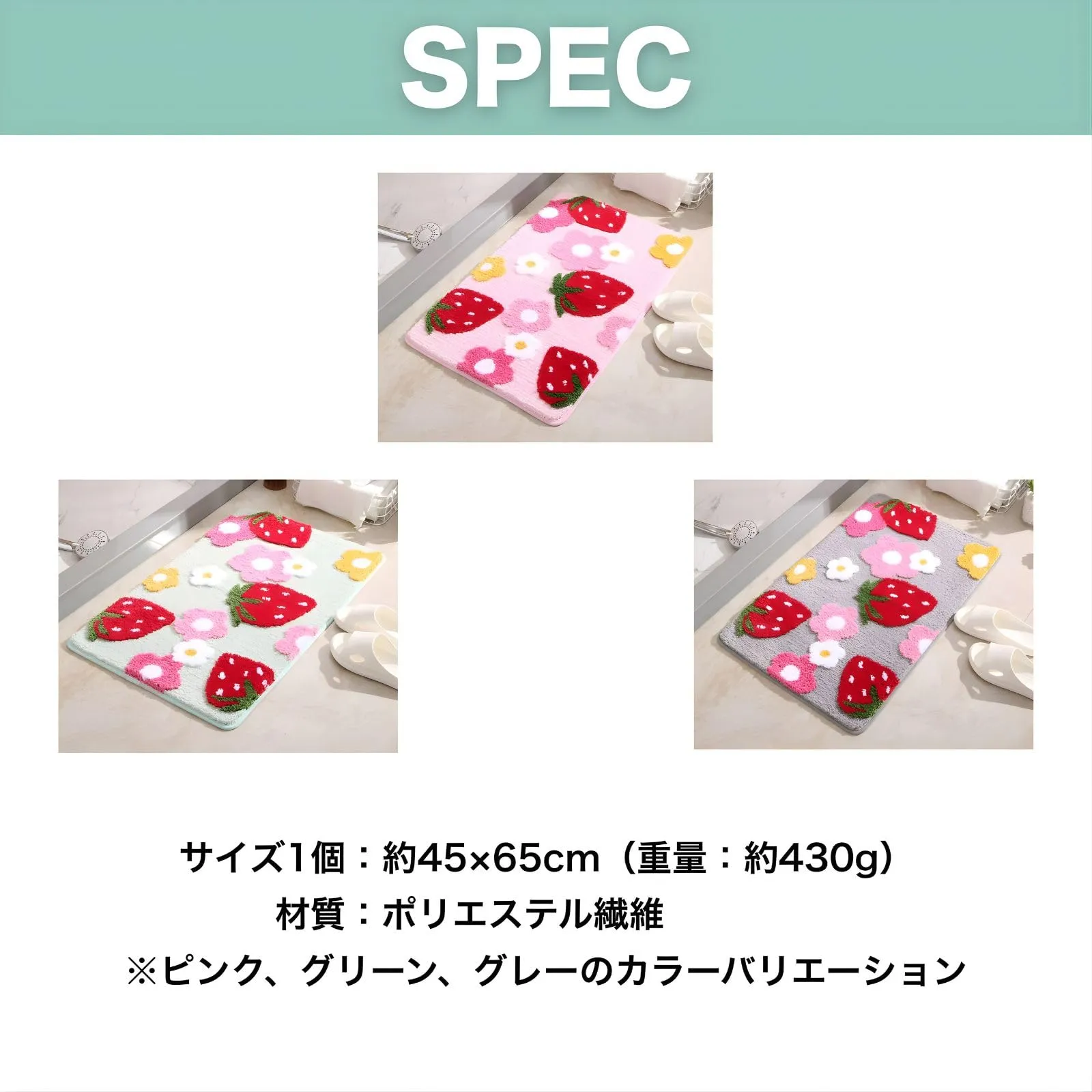 【商品仕様】サイズ1個:約45×65cm(重量:約430g) / 材質:ポリエステル繊維 ※ピンク、グレー、グリーンのカラーバリエーションをご用意しているので、お好きなものをお選びください。※モニターの環境により、色の見え方に若干差が生じる場合がございます。 「玄関マット いちご バスマット」は、玄関やお部屋の入り口、そしてサニタリースペースを明るく彩る、イチゴとハート柄のフロアマット&バスマットです。このマットが目に入るたび、ふっと心が和むようなデザインが魅力。 高密度のポリエステル繊維(ポリエステル)を使用しており、水滴やホコリをしっかりキャッチ!玄関マットとしてなら靴底の水分を、バスマットとしてなら足元の水分をすばやく吸い取り、床を濡れからしっかり守ります。 吸水性に加え速乾性にも優れているため、湿気がこもりにくく、清潔を保ちやすいのが特徴です。お手入れは手洗いが可能なうえ、掃除機にも対応しているため、日常のお手入れが非常に簡単で衛生的です。 デザインは可愛いながらも、全体は「現代シンプル(モダンシンプル)」なスタイルを採用。派手すぎず、様々なインテリア(北欧、韓国風、シンプルモダンなど)に自然に馴染み、お部屋全体のコーディネートを邪魔しません。