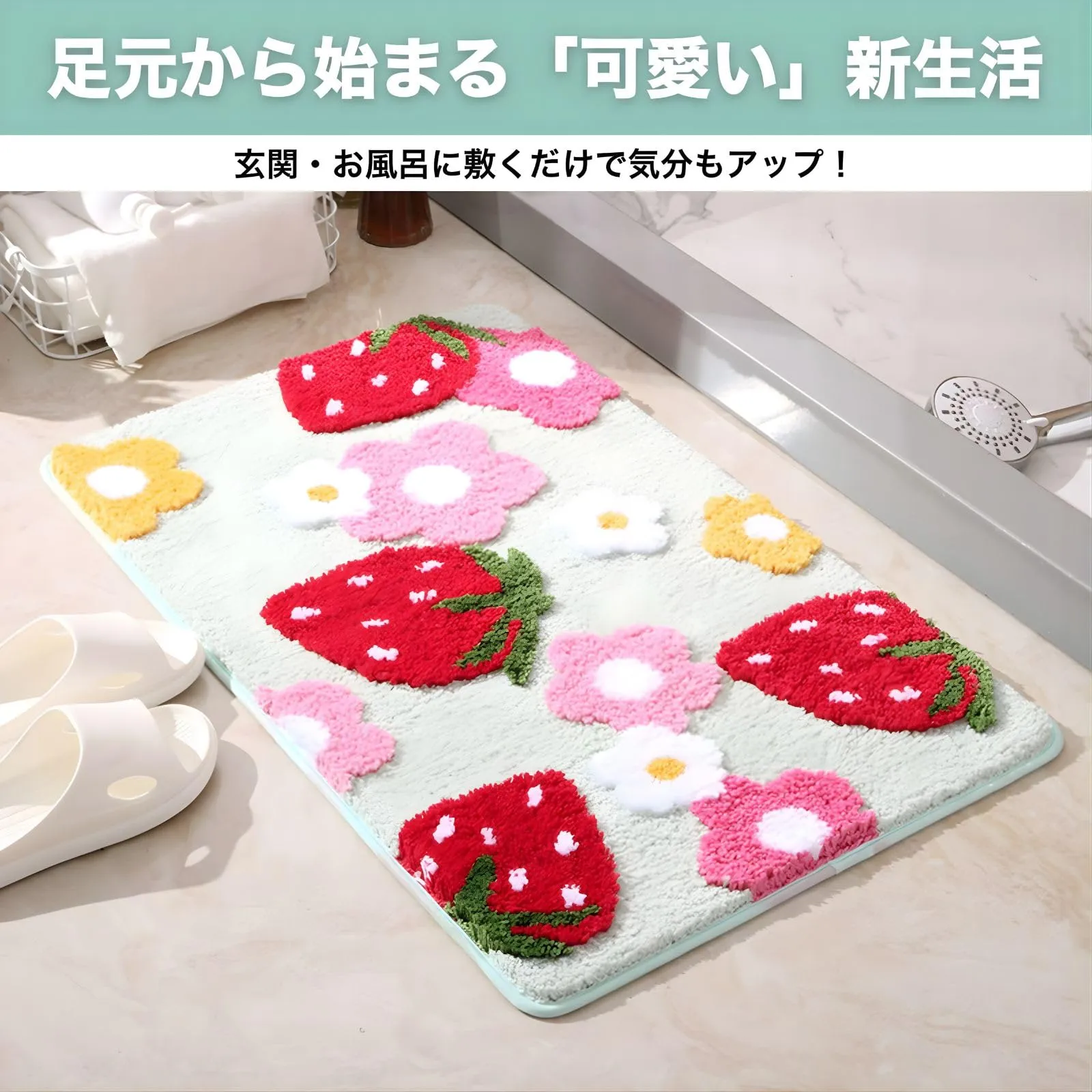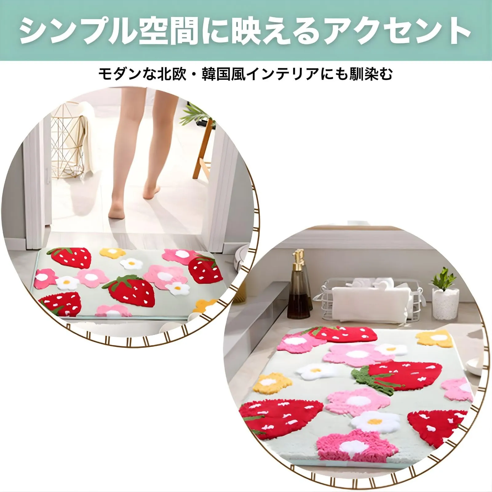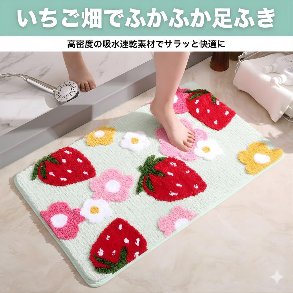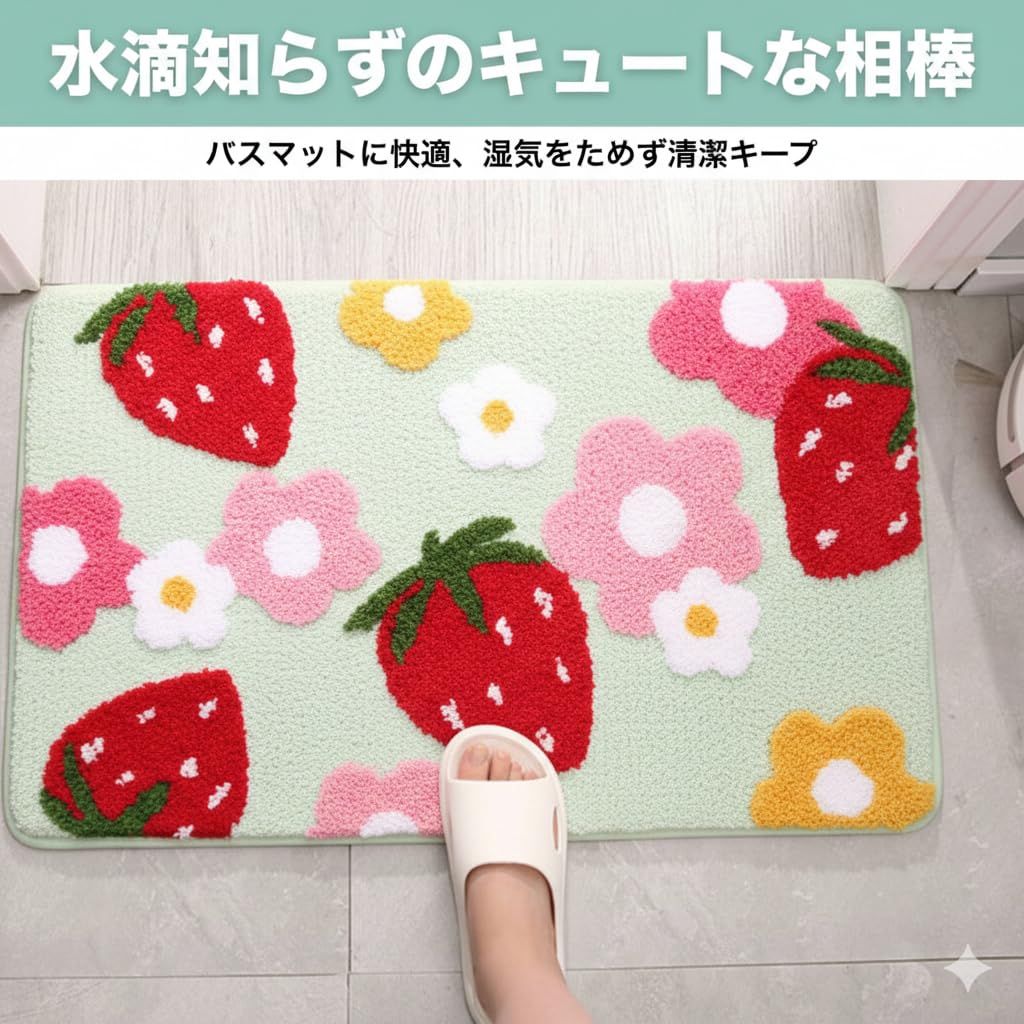 バスマット」は、玄関やお部屋の入り口、そしてサニタリースペースを明るく彩る、イチゴとハート柄のフロアマット&バスマットです。このマットが目に入るたび、ふっと心が和むようなデザインが魅力。✅高密度のポリエステル繊維(ポリエステル)を使用しており、水滴やホコリをしっかりキャッチ!玄関マットとしてなら靴底の水分を、バスマットとしてなら足元の水分をすばやく吸い取り、床を濡れからしっかり守ります。✅吸水性に加え速乾性にも優れているため、湿気がこもりにくく、清潔を保ちやすいのが特徴です。お手入れは手洗いが可能なうえ、掃除機にも対応しているため、日常のお手入れが非常に簡単で衛生的です。✅デザインは可愛いながらも、全体は「現代シンプル(モダンシンプル)」なスタイルを採用。派手すぎず、様々なインテリア(北欧、韓国風、シンプルモダンなど)に自然に馴染み、お部屋全体のコーディネートを邪魔しません。✅