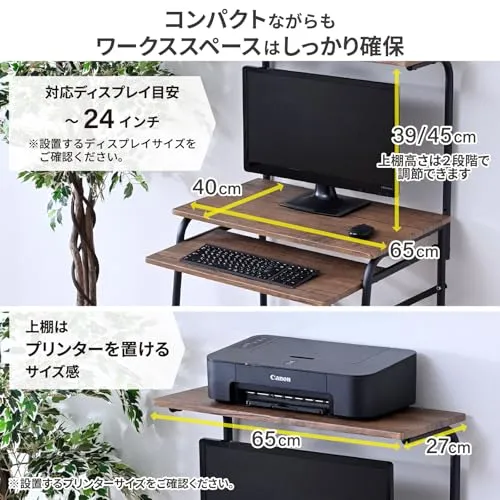 【PCディスプレイ対応目安】24インチ(天板内寸:幅65奥行40高さ39/45)※お使いのディスプレイのサイズをご確認ください。 本体サイズ(約) : 幅65奥行49高さ116/122cm上棚サイズ : 6527cm天板サイズ : 6540cm材質:フレーム/スチール(エポキシ樹脂塗装)、天板/合成樹脂化粧繊維板(塩化ビニル樹脂)耐荷重 : 全体32(天板 : 18、上棚 : 6、スライド棚 : 8kg)
