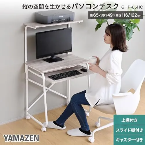 山善(YAMAZEN) パソコンデスク コンパクト (上棚/スライダー/キャスター付き) 幅65×奥行49×高さ116/122cm 学習机 勉強机 組立品 アンティークアイボリー/サンドホワイト GHP-65HC(AIV/SWH)/