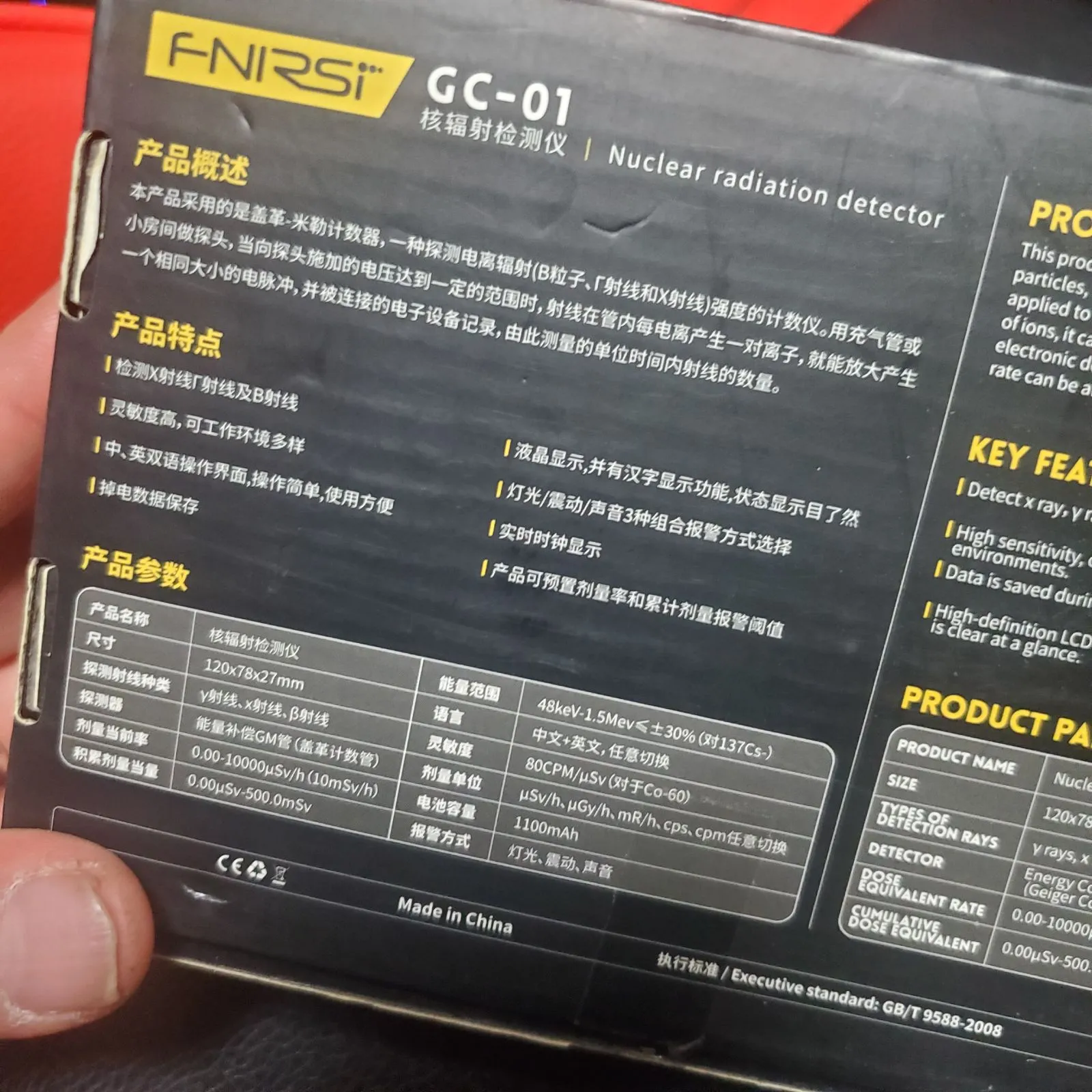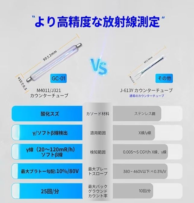 【GC-01 仕様】ガイガーカウンターGC-01はGMセンサー内蔵して、応答速度が速く、精度が高い放射線測定器です。ガンマ線(γ線)、ベータ線(β線)、X線を検出できます。積算線量当量:0.00uSv-500.0mSv。エネルギー範囲 48KeV-1.5MeV ≤ ± 30% (セシウム-137の場合)