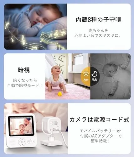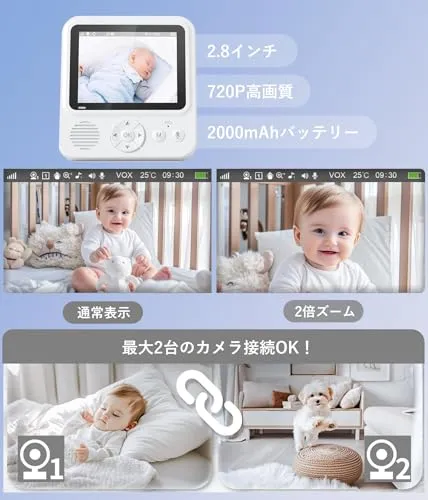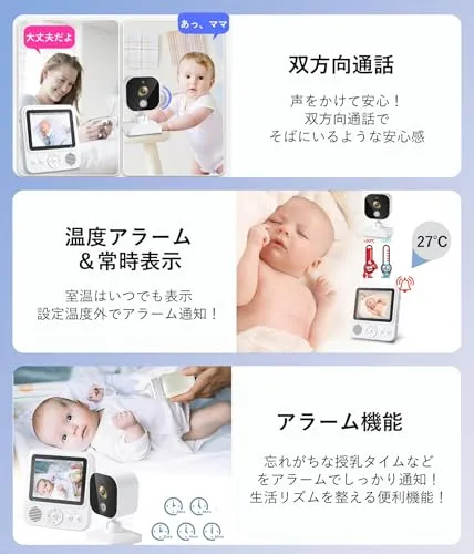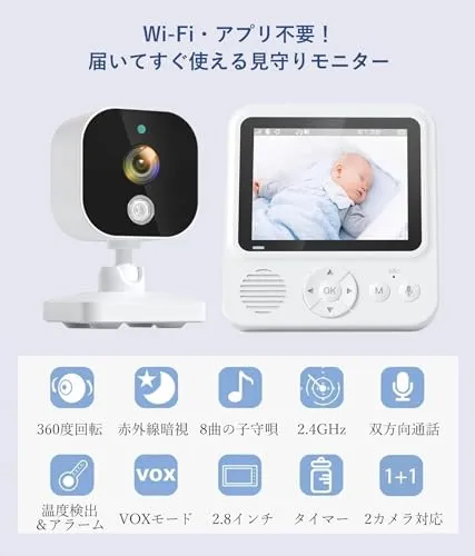 【8種子守唄・目覚まし・音量&明るさ調整】8種類の子守唄内蔵で、赤ちゃんをやさしく眠りに誘導。目覚ましアラーム、音量や明るさ調整など機能も搭載し、育児のサポート機能が充実。赤ちゃんはもちろん、高齢者やペットの見守りにもおすすめ。セット内容:?カメラ1、?モニター1、?USB-C電源ケーブル2、?ACアダプタ2、?日本語取扱説明書。年中無休営業メッセージは12時間以内に対応!