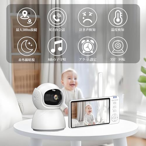 【高画質5インチ大画面&Wi-Fi・アプリ不要】5インチカラー液晶モニターで、赤ちゃんの表情や動きをくっきり確認できるみまもりカメラ。720P高解像度で、細かい動きも逃さず映し出します。Wi-Fiやアプリ不要、2.4GHzワイヤレス接続で、設定不要ですぐに使用開始。干渉に強く、安定した接続で、届いてすぐに安心して使えます。屋外障害物なしで最大300m、屋内でも約20mの長距離通信できるワイヤレスベビーモニター(※使用環境により変動)。